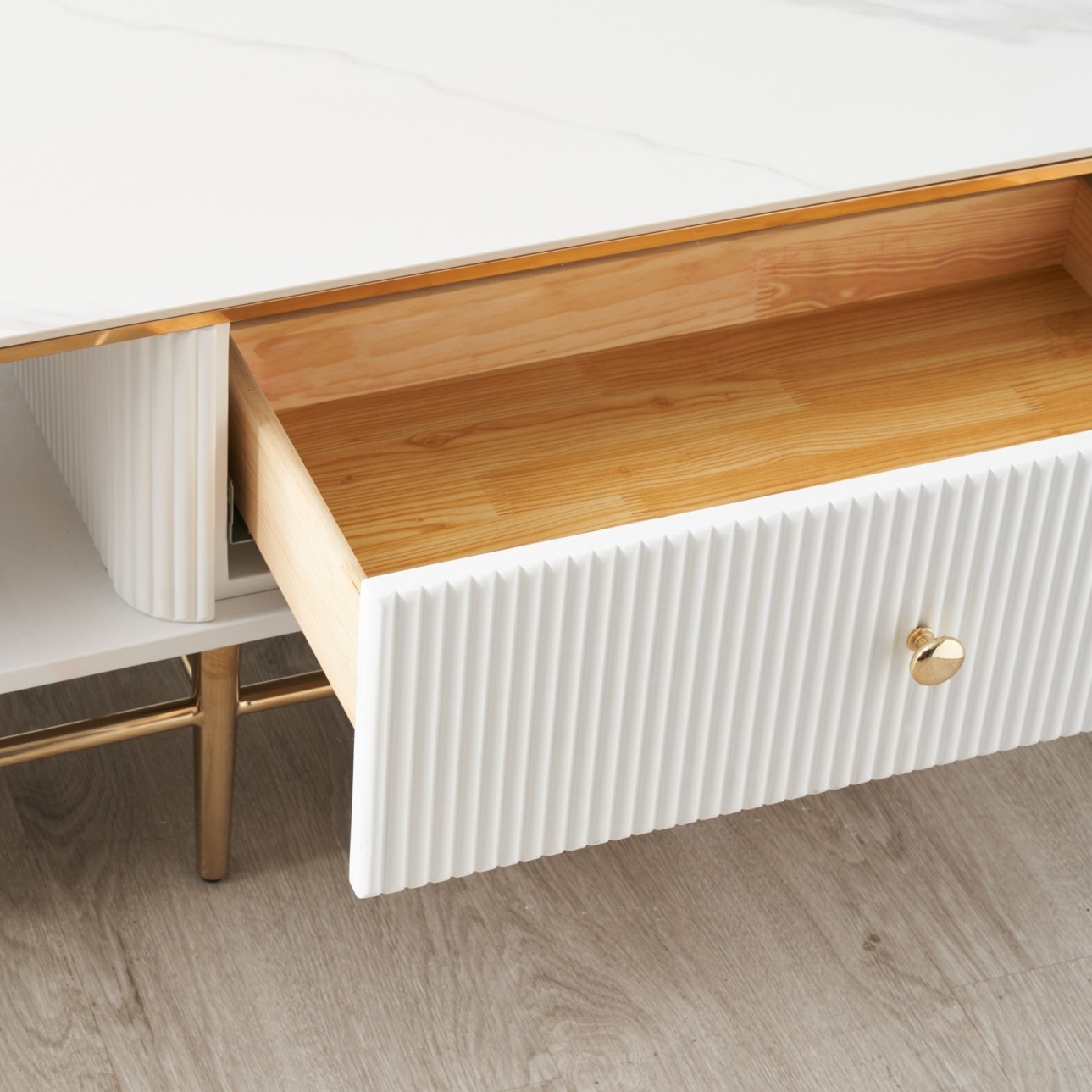 Etienne Entertainment Unit holds a secret amongst its splendour to offer stylish utility to your home's busiest areas. Its overall design is a modern interpretation of the Art-Deco style, known for its triumphant boldness. A striking array of vertical reeds decorates the entirety of the Etienne's front panel to create a dynamic effect that changes and grows more beautiful from one angle to the next.