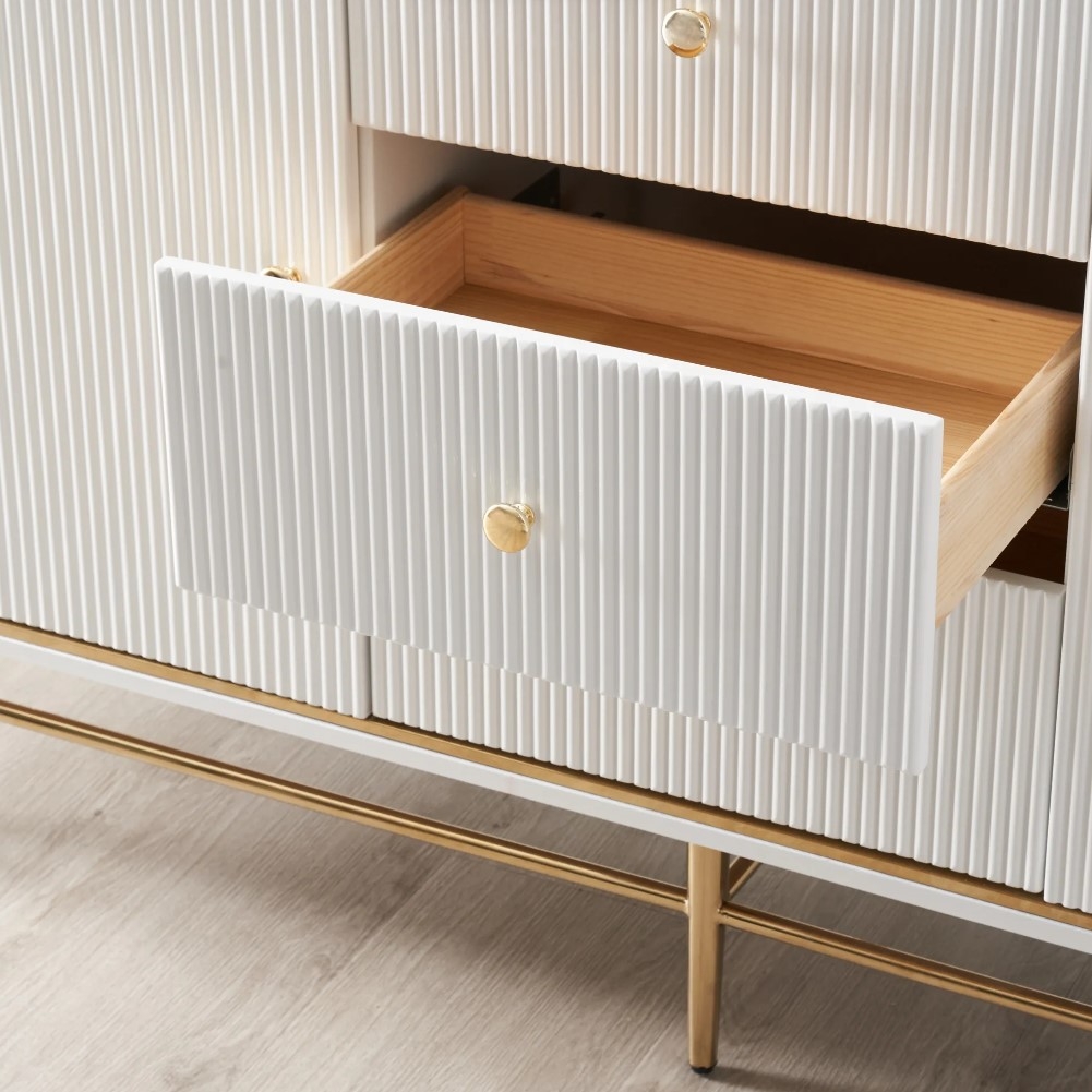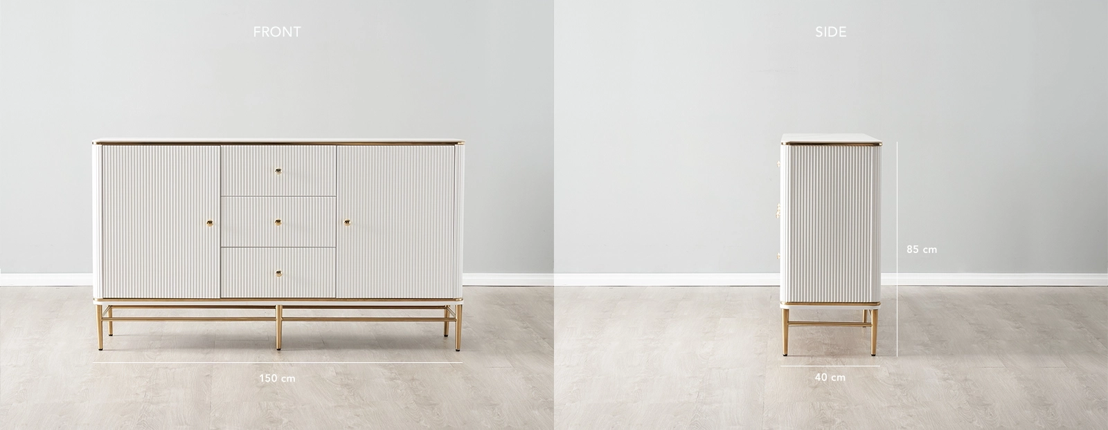 The artistic Art-Deco-inspired looks to hold a wealth of secret spaces underneath. Pulling on one of its golden handles reveals cabinets with shelves and open drawers that will surely help with all your kitchen curating needs. Store your plates, cutlery and more on the Etienne's spacious shelves and drawers. The entirety of the Etienne Sideboard is supported with a well-crafted metal frame that shines in golden hues.