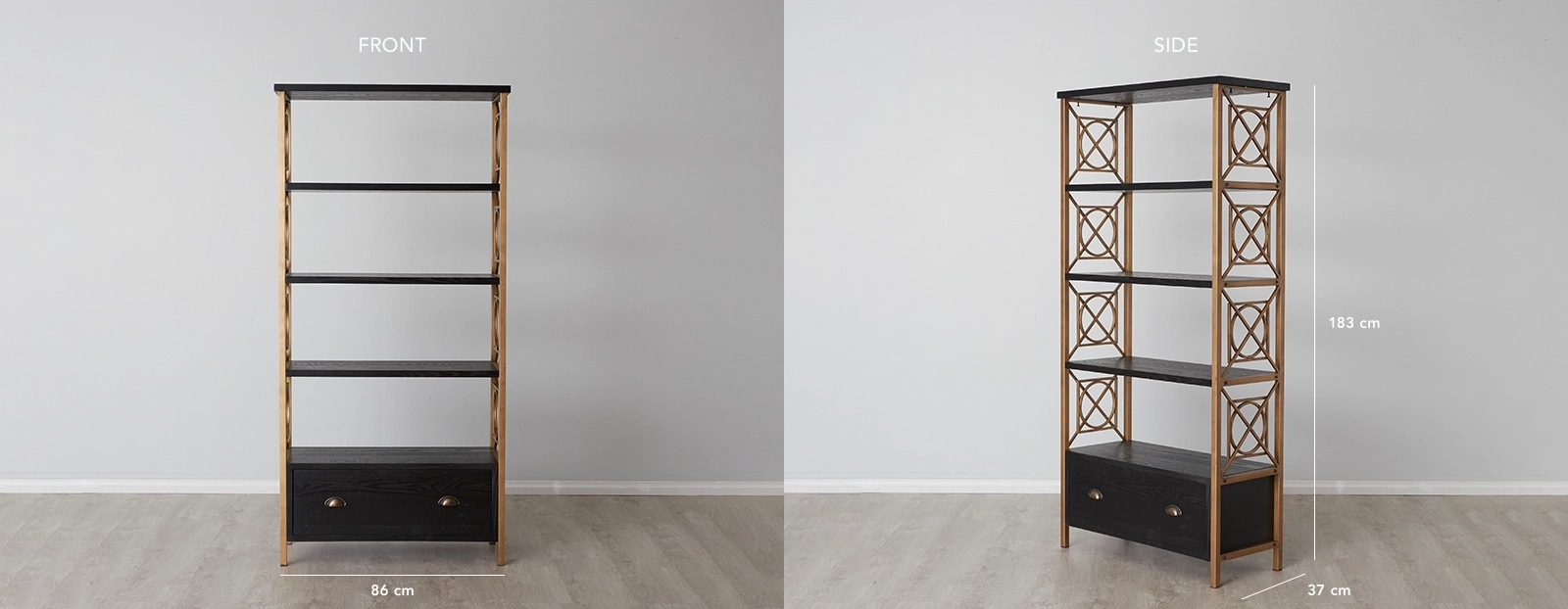 Its black veneer shelves combined with the lustrous gold frame create an art deco aesthetic that will elevate the feeling of luxury of your home. One very spacious drawer resides at the bottom of the Eugenie for all your curating needs. The Eugenie Black Wooden Venner Bookshelf pairs beautifully with one of our floor lamps and side tables.