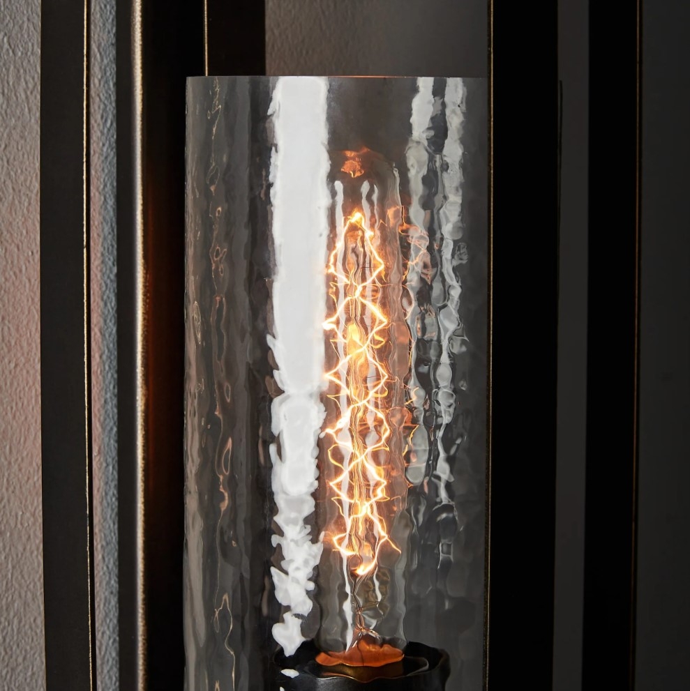 At the heart of this enchanting piece lies its incandescent bulb, a symbol of classic illumination that exudes a warm and inviting glow. This bulb, however, is not simply exposed. Instead, it nestles within a cover of hammered glass, which, with its textured surface, disperses the light in a playfully mottled pattern across walls and spaces.