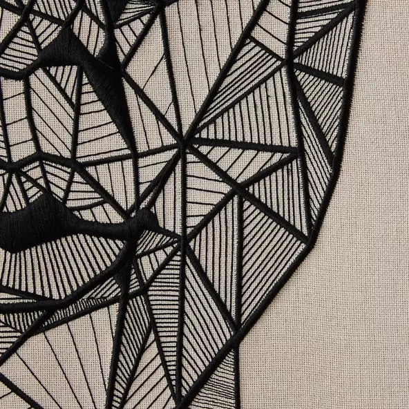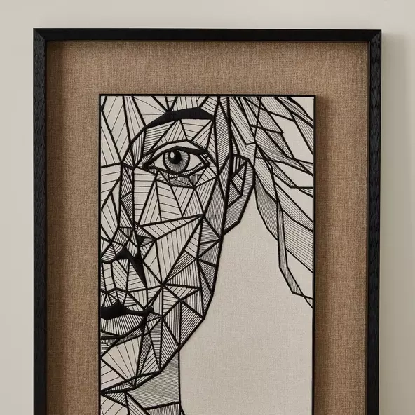 The Female Geometric Shadow Box features a geometric abstraction of a female face, crafted with precise black lines that contrast beautifully against a textured beige background.