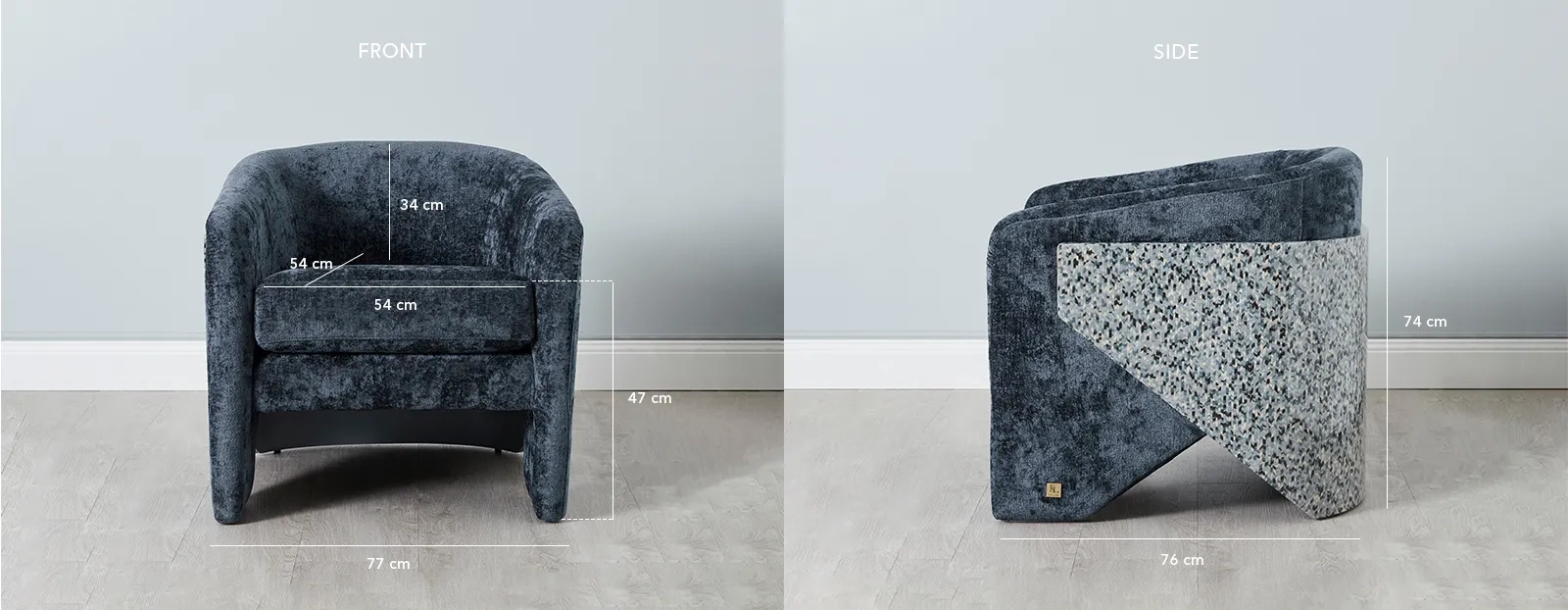 The Finn features a unique veneer wrap-around with a white, black, and blue terrazzo design that adds style and character. Its sturdy construction ensures stability, making it a distinctive occasional chair for any living room.