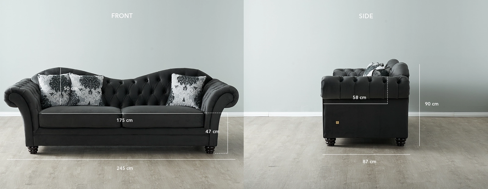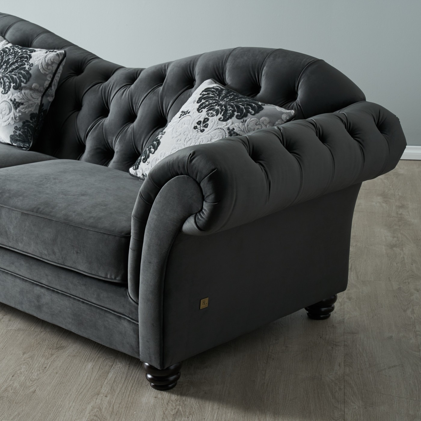 Lounge in its cushioned seats, draped in charcoal-colored velvet fabric, while the diamond-tufted back rest adds sophistication.