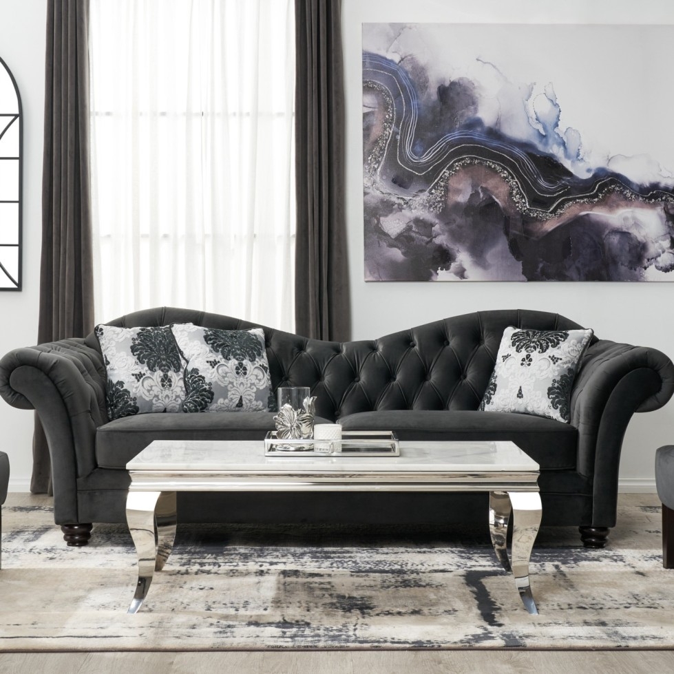 Florence II Charcoal Velvet 3-Seater Sofa with Floral Cushions