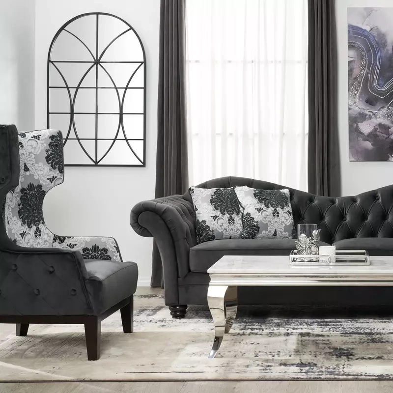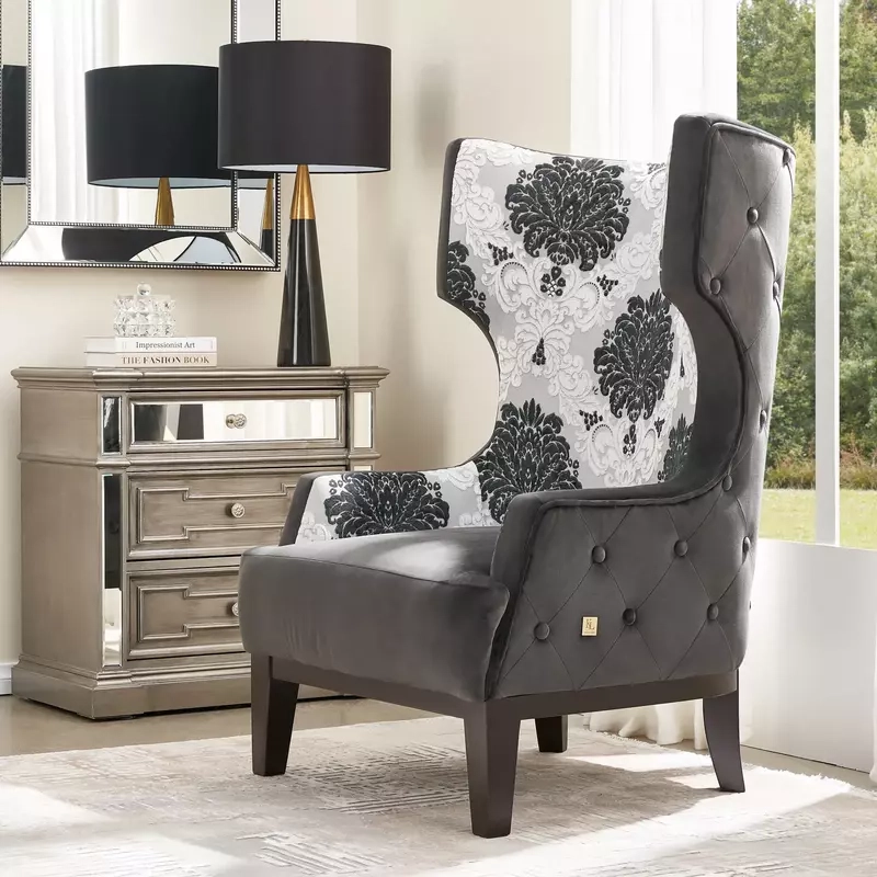 The Florence II Occasional Chair enhances the classic armchair design with a high-back frame featuring elegant curves. Upholstered in soft charcoal velvet with dense foam cushioning, it offers comfort and a refined look.