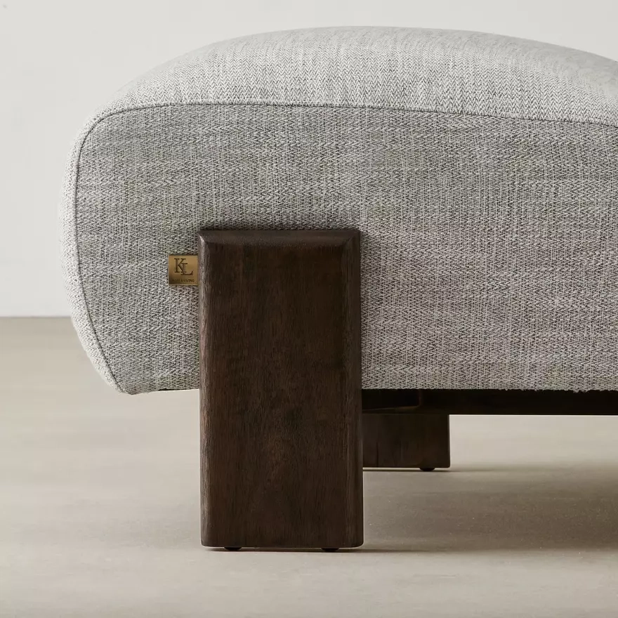 The light grey fabric contrasts beautifully with the dark wood frame, while the sturdy legs add rustic charm and stability, creating a comfortable and aesthetically pleasing piece.