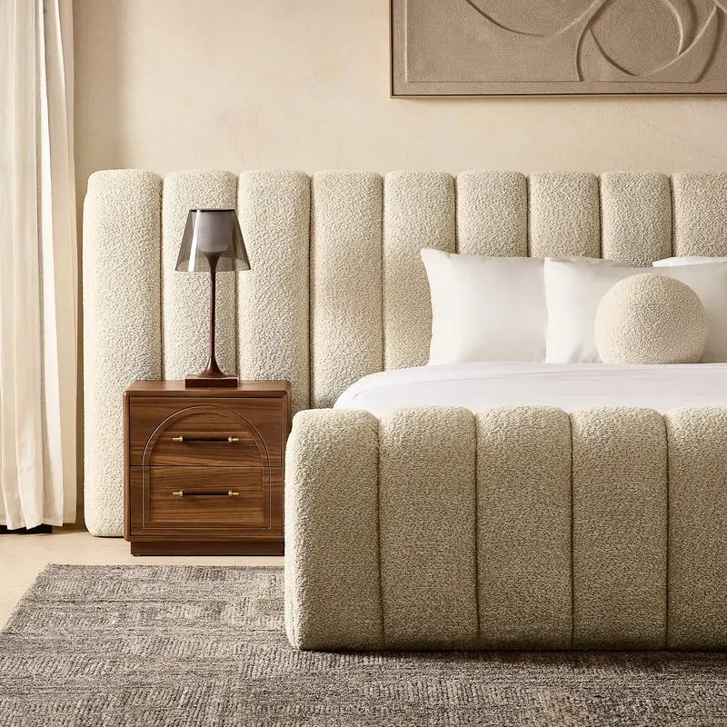 The Gabriella Bed brings sculptural softness to the bedroom with its channel-tufted design and enveloping silhouette. Each vertical tuft adds rhythm and depth, creating a sense of calm and gentle structure.