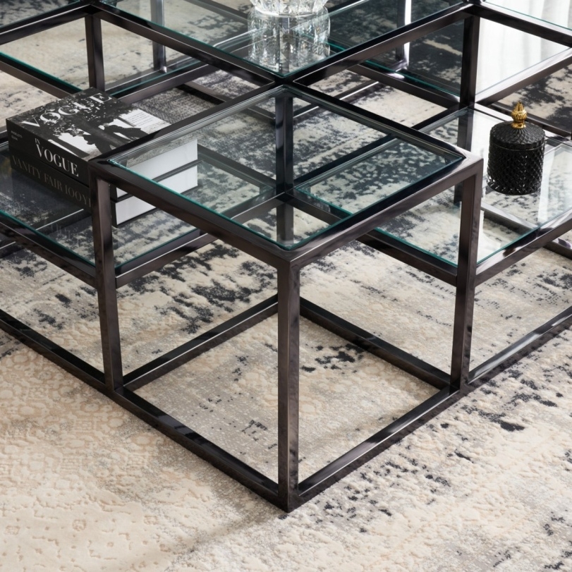 The Geometric Coffee Table features a multilevel design with nine interconnected tables, combining a sleek black stainless-steel frame with tempered glass tops. Its art-deco-inspired style and versatile surfaces make it ideal for displaying decor or keepsakes, adding a modern touch to any living room.