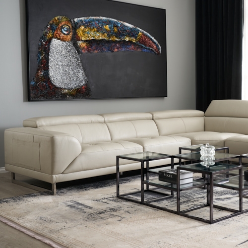 The Geometric Coffee Table features a multilevel design with nine interconnected tables made from stainless steel and glass. Its unique structure offers flexibility and adds a modern touch to any living space.