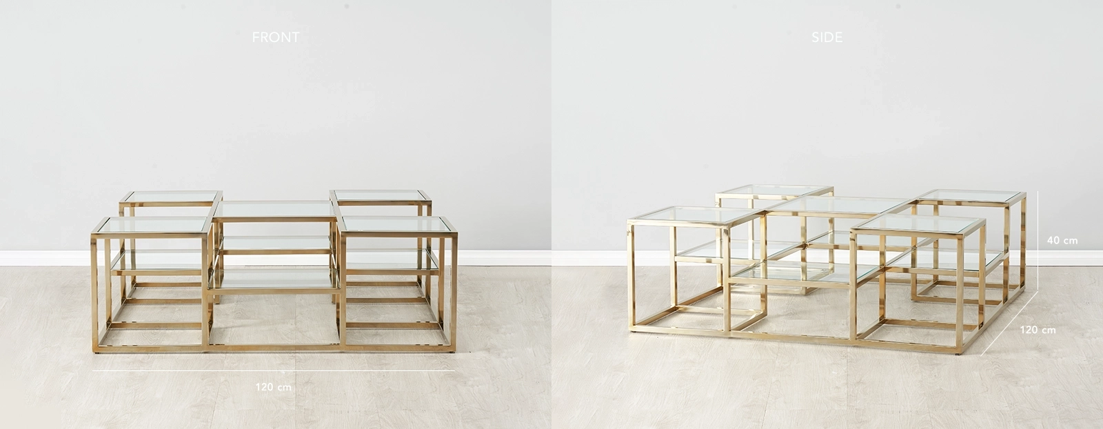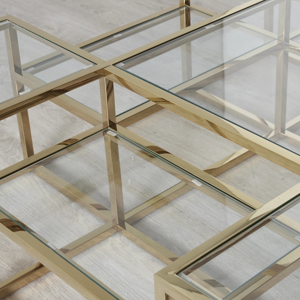 The Geometric Coffee Table features a multilevel design with nine interconnected tables made from stainless steel and glass. Its unique structure offers flexibility and adds a modern touch to any living space.