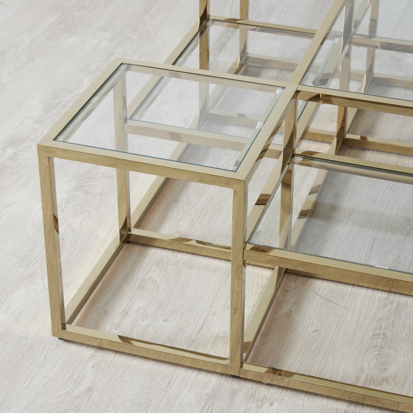 The Geometric Coffee Table features a multilevel design, combining a sleek stainless-steel champagne gold frame with tempered glass tops. Its art-deco-inspired style and versatile surfaces make it ideal for displaying decor or keepsakes, adding a modern touch to any living room.