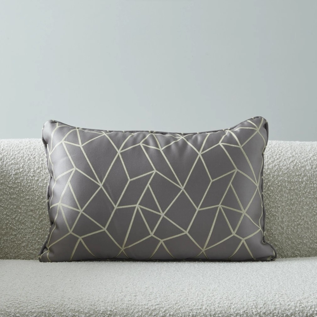 It features a grey linen cover that is not only soft to the touch but also incredibly durable, ensuring that it will be a beloved part of your home for years to come. The cover is adorned with a polygon-like pattern in light neutral colours, adding a touch of subtle sophistication and visual interest without overwhelming the space.