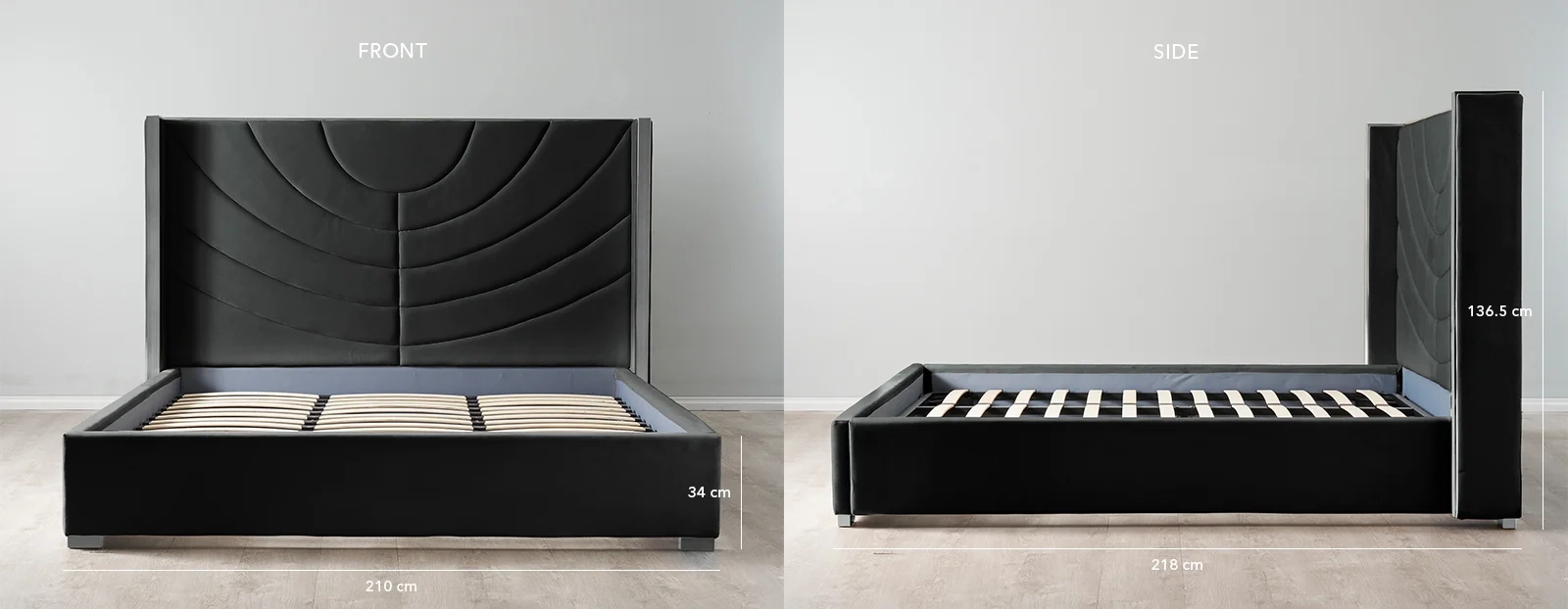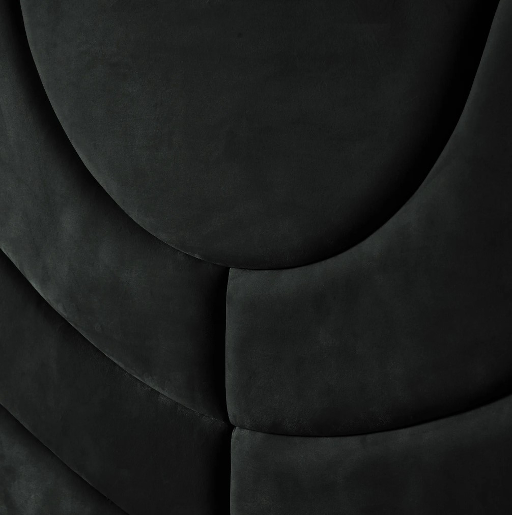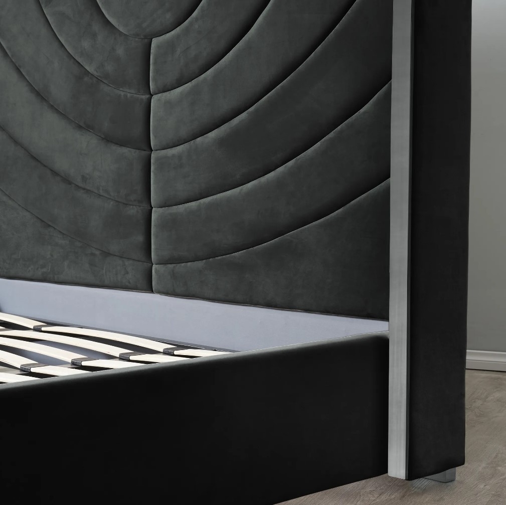 The Gertrude possesses' qualities that will elevate your bedroom's style to heavenly heights. This majestic piece is made from high-quality materials and features a luxurious charcoal and black nickel colour scheme that fits modern or minimalistic themes. The Charcoal Velvet headboard is artistically designed with elegant curves and lines reminiscent of beautiful sand art. Supporting each side of the bed are two black nickel frames that add to its luxurious aesthetic.
