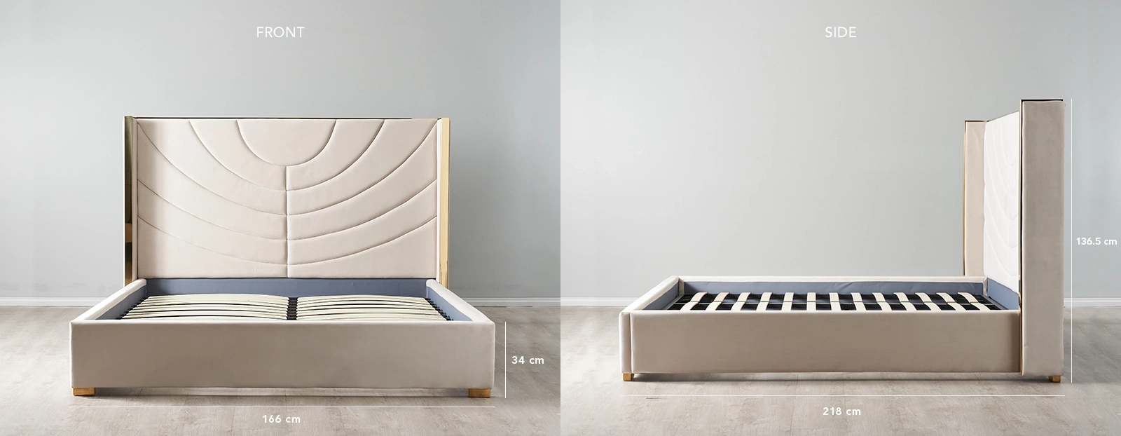 The Gertrude possesses' qualities that will elevate your bedroom's style to heavenly heights. This majestic piece is made from high-quality materials and features a luxurious white and gold colour scheme that fits modern or minimalistic themes. The Velvet headboard is artistically designed with elegant curves and lines reminiscent of beautiful sand art. Supporting each side of the bed are two golden frames giving the piece a chic and luxurious aesthetic. This combination of stylish design and gorgeous colours makes the Gertrude an undeniable focal point for your bedroom.
