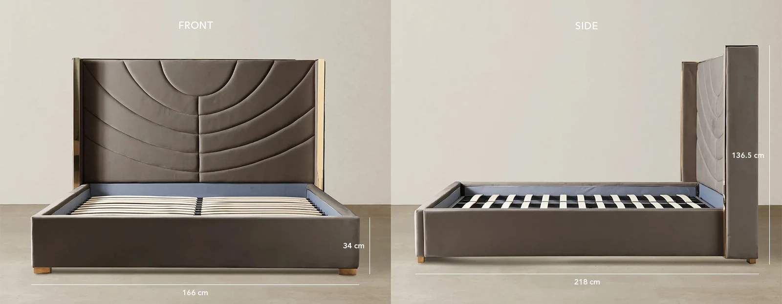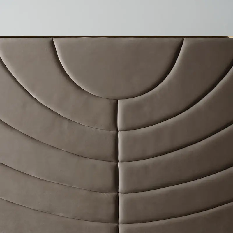 The Gertrude Mushroom Velvet Queen Bed adds a refined touch to any bedroom with its mushroom velvet headboard, elegantly designed with flowing curves reminiscent of sand art. A brushed champagne gold stainless steel frame enhances its modern aesthetic, making it a striking centrepiece.