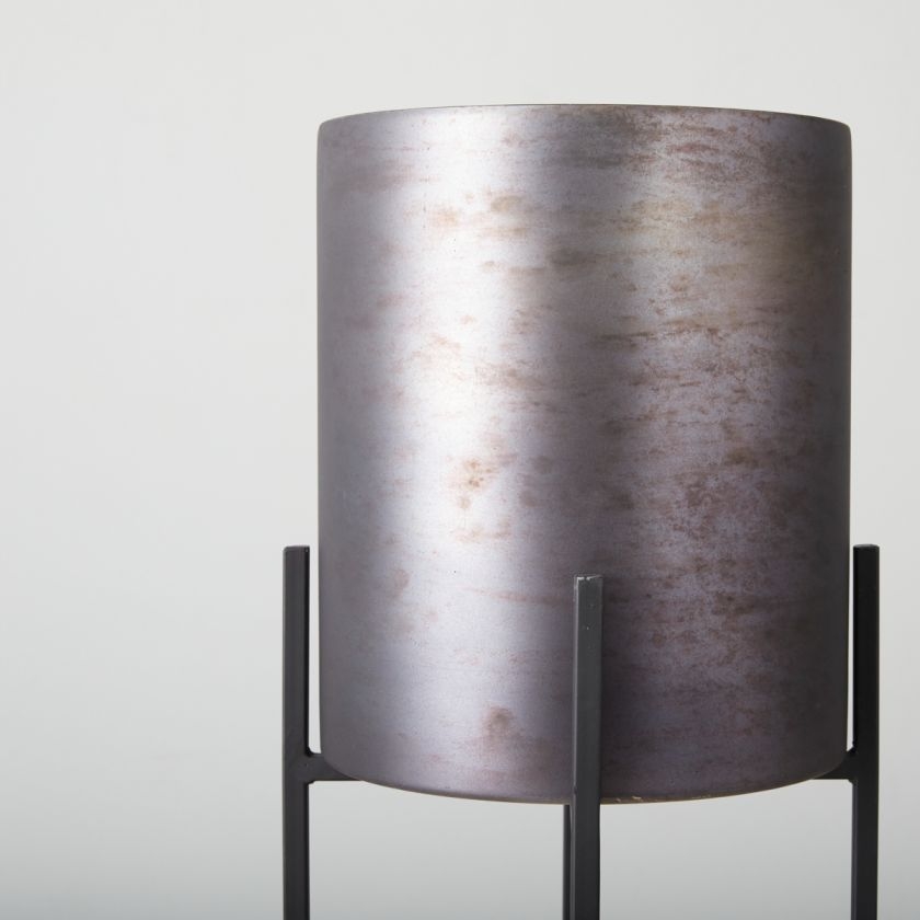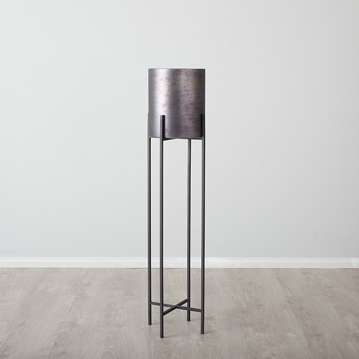 The stand's clean, linear design complements the vase's organic texture, creating a harmonious balance of industrial chic and natural charm.