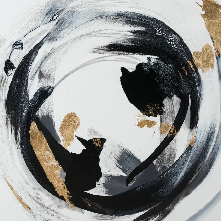 The artistic arrangement of golden highlights amidst the sea of black strokes is the centerpiece of this painting. These radiant golden accents create a mesmerizing contrast with the dark, swirling background, drawing the viewer's attention and sparking a sense of intrigue.