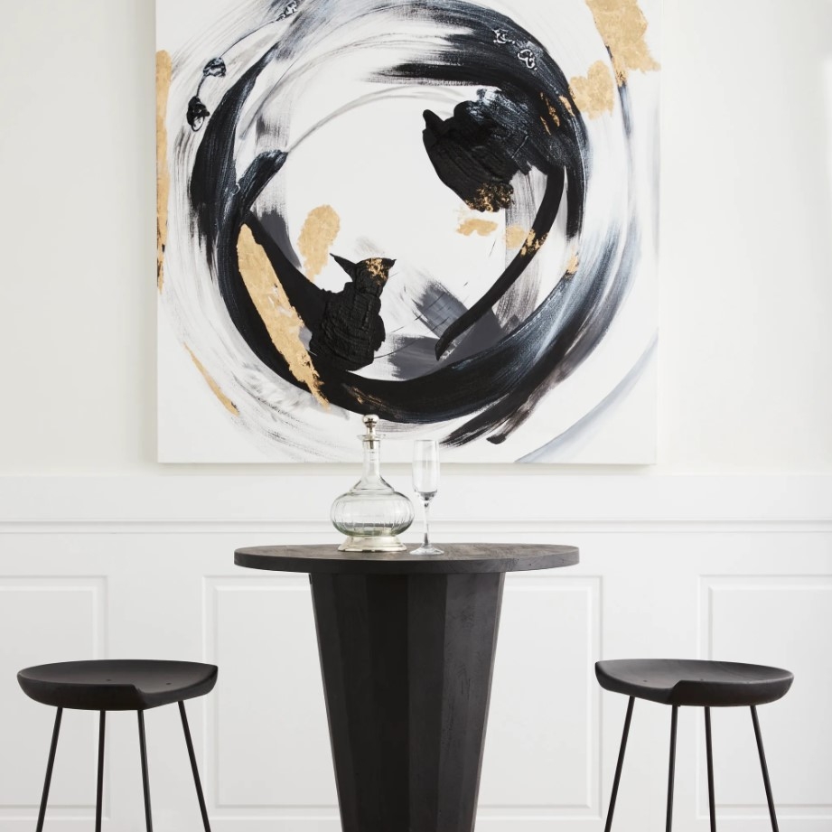The Gold Rush Painting is a captivating work of art that mesmerizes viewers with its dynamic interplay of colors and shapes. At its core is a composition characterized by swirling, bold black strokes set against a pristine white canvas, and punctuated by the striking presence of golden highlights.