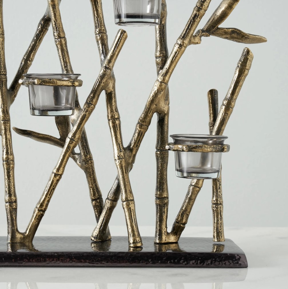 Each bamboo shoot is meticulously detailed, with grooves and nodes that mirror the natural elegance of real bamboo. Coloured in a lustrous golden hue, the shoots reflect light beautifully, creating a warm and inviting ambiance in any room. The bamboo shoots hold five glass candle holders, each carefully positioned at different sections to create an aesthetically pleasing arrangement.