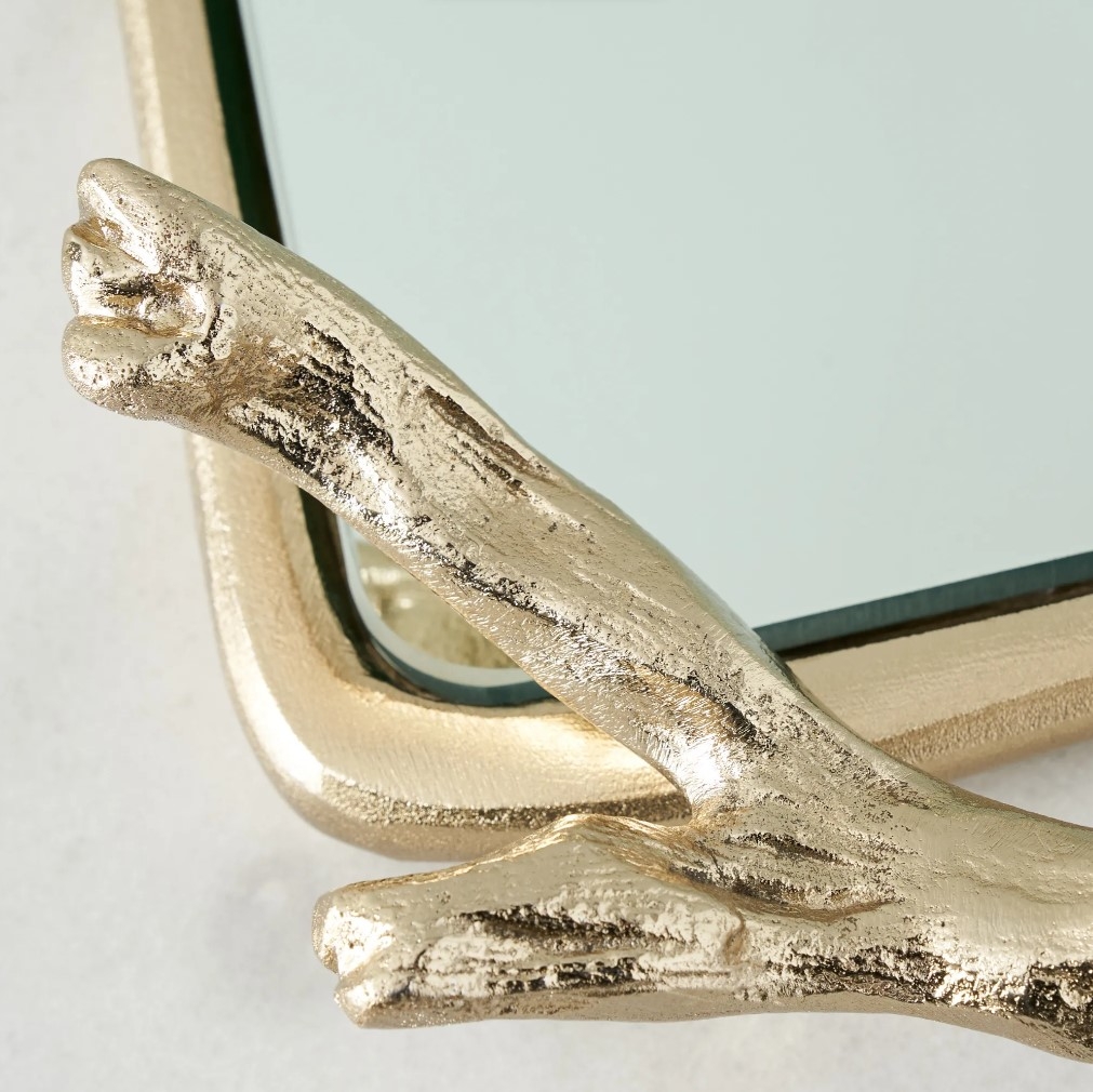 The mirrored surface itself is a statement piece. It reflects light beautifully, creating a sense of space and adding a touch of glamour to any room. Formed in the shape of branches, its handles are not only functional but also add to the stand-out nature of the tray. They infuse an element of nature into the design, creating a stunning contrast with the polished mirror surface and golden borders.