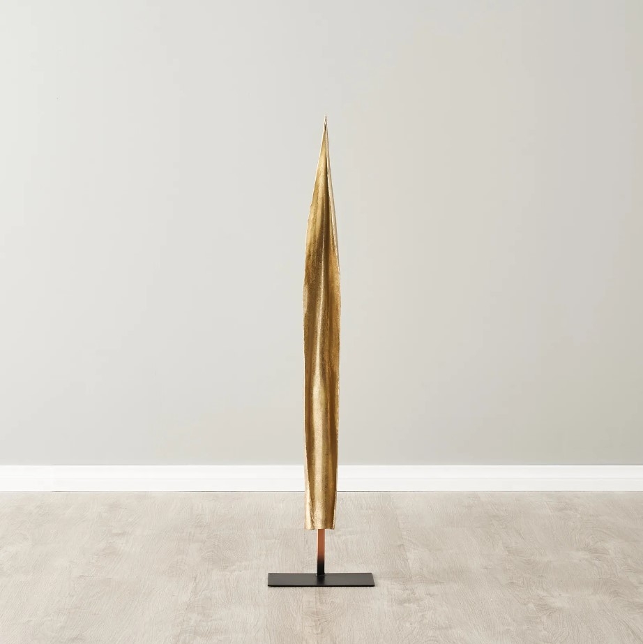 The Golden Leaf Resin Metal Stand, standing at an impressive height of 98cm, is a striking piece of modern decor that effortlessly marries the organic form of nature with the sleek sophistication of contemporary design. Crafted from high-quality resin, this sculpture captures the delicate veining and gentle curve of a leaf, a testament to the skillful artistry required to replicate such natural details.