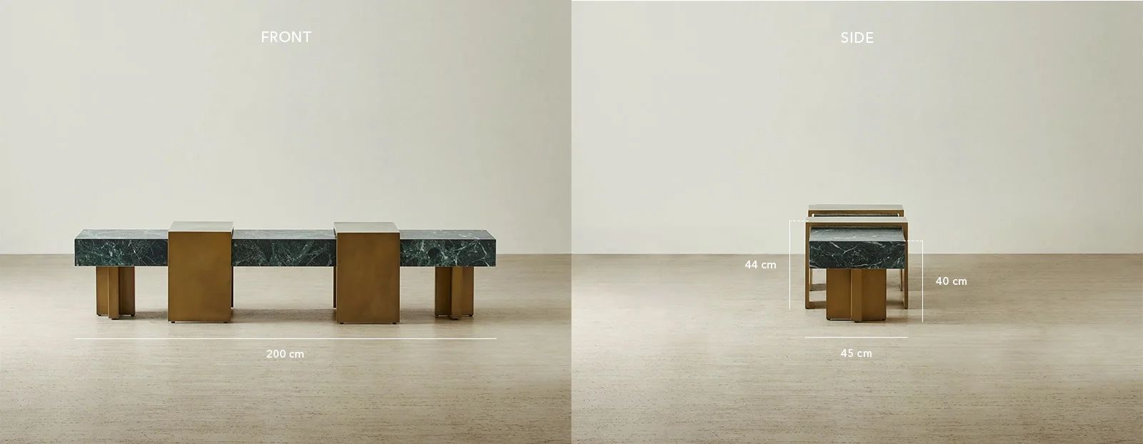 The Grayson Entertainment Unit is anchored by an emerald-green sintered stone top. Its brushed bronze legs create a strong geometric base, with central supports that can shift position to suit your space.