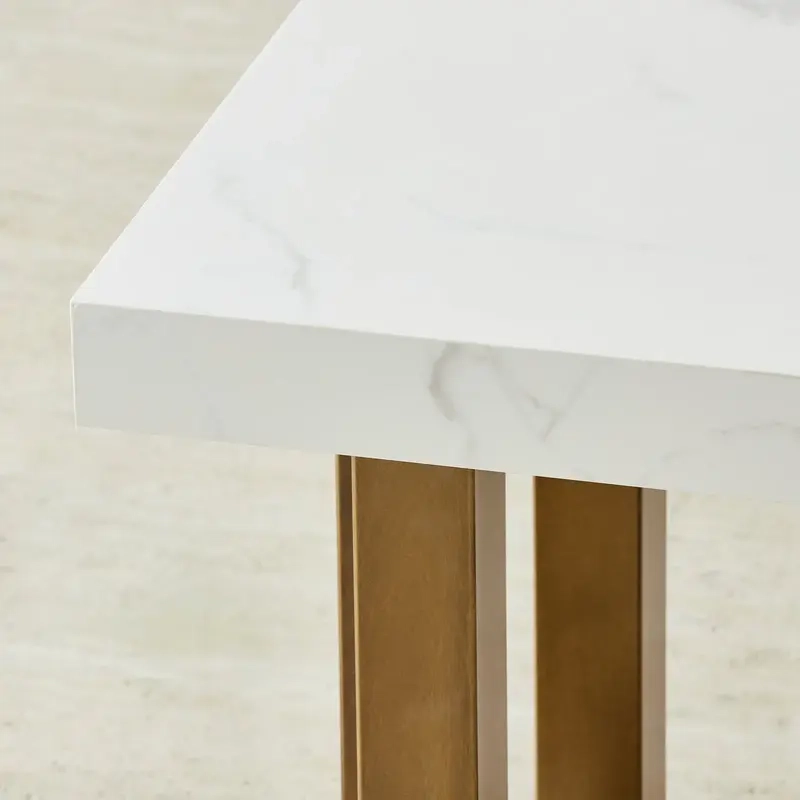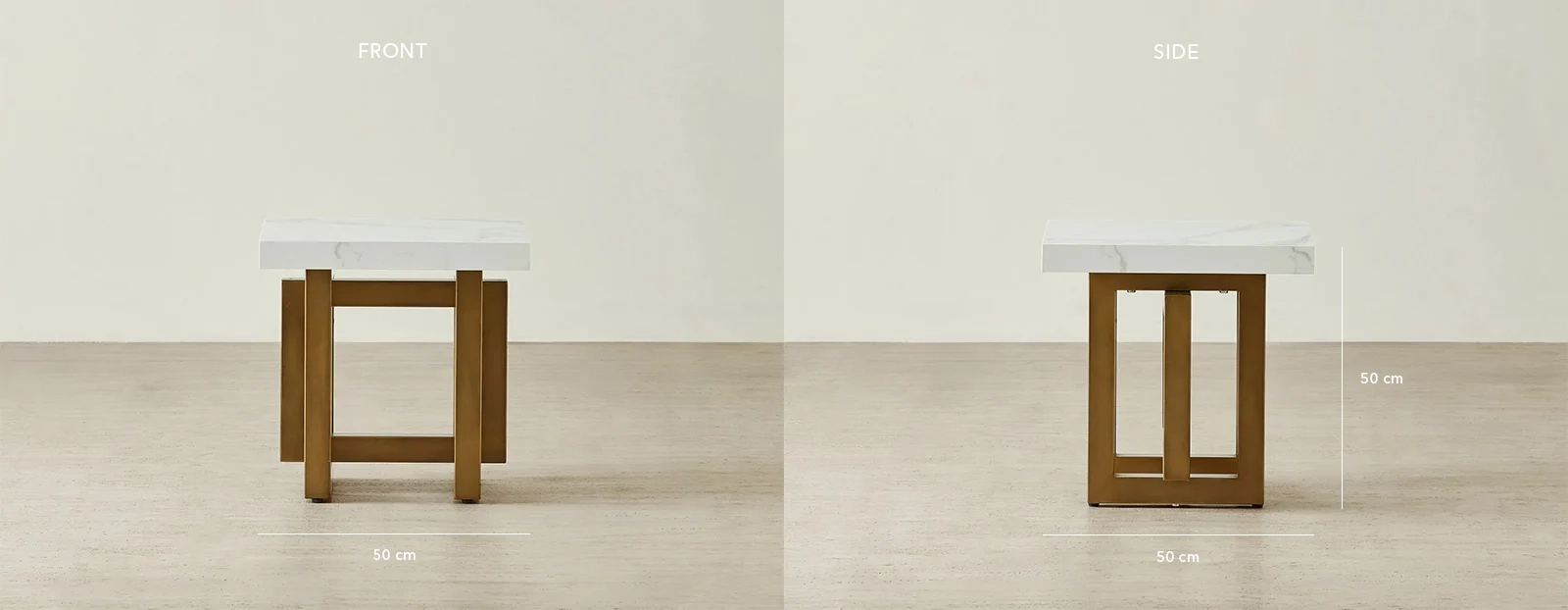 Striking and compact, the Grayson Side Table brings bold contrast and clean geometry to any space. Its beautiful white sintered stone top showcases rich veining and natural depth, offering the refined look of genuine stone in a durable form.