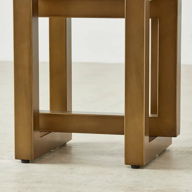 The brushed bronze base forms a sculptural silhouette with interlocking rectangular legs, adding structure and visual interest. Ideal beside a sofa or bed, the Grayson Side Table blends strong form with practical surface space.