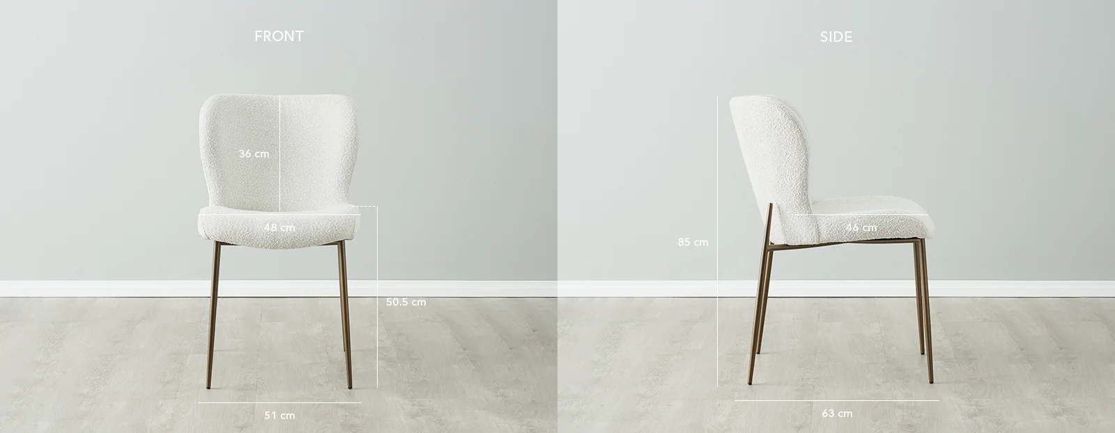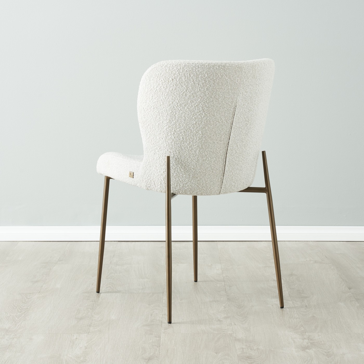 The Hailey features a striking Bronze metal frame that extends over the seat's backrest. This unconventional leg frame makes for quite the striking sight as it adds a uniqueness that makes the Hailey Snow White Boucle Dining Chair stand out. The Hailey Dining Chair comes in many fabric and colour variants. It works best in a set along with one of our gorgeous dining tables.