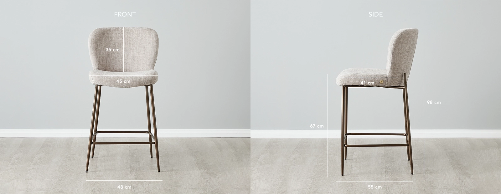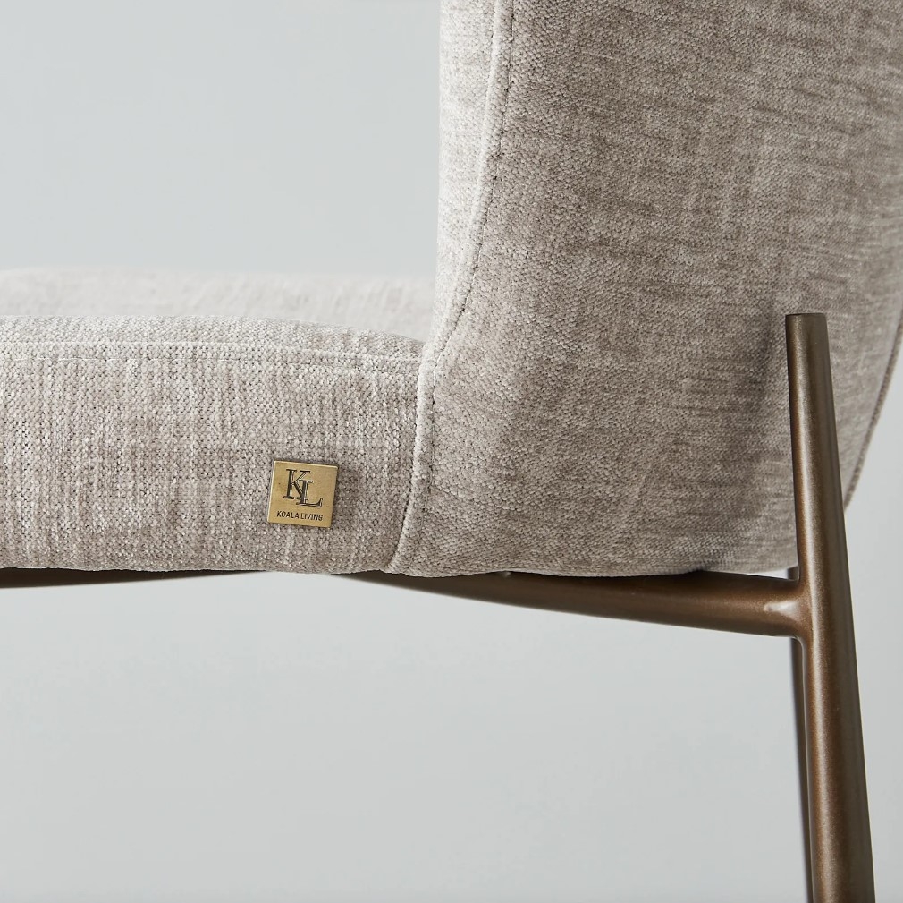 This fabric comes in a vintage Grey shade, which adds to the Hailey's sophistication. Four gorgeously crafted metal legs seamlessly flow from the seat and are joined below the base to provide a helpful footrest for lengthy conversations. These legs come in a bronze shade that accentuates their simplicity and beauty. The Hailey works best in a pair and comes in a wide variety of colours.
