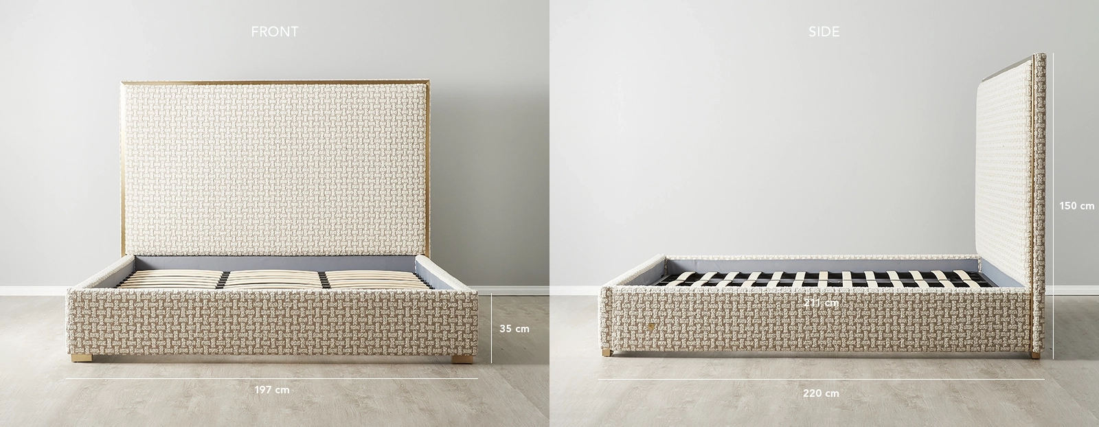 Supported by a set of golden metal legs, the Harlow bed exudes an additional touch of opulence and luxury. These legs complement the design perfectly, adding a glamorous and sophisticated element that completes the look of this remarkable piece. The Harlow King Bed features a row of perfectly cut slats, meticulously arranged to provide optimal support for your beautiful mattress. This thoughtful design ensures comfort and stability, allowing you to rest peacefully and wake up refreshed.