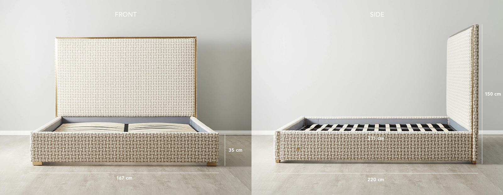 Supported by a set of golden metal legs, the Harlow bed exudes an additional touch of opulence and luxury. These legs complement the design perfectly, adding a glamorous and sophisticated element that completes the look of this remarkable piece. The Harlow Queen Bed features a row of perfectly cut slats, meticulously arranged to provide optimal support for your beautiful mattress. This thoughtful design ensures comfort and stability, allowing you to rest peacefully and wake up refreshed.