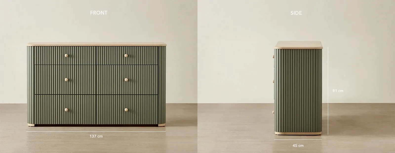 With six roomy drawers, there’s space for clothes, toys, and treasures alike. Rounded edges and ribbed sides bring a playful texture.