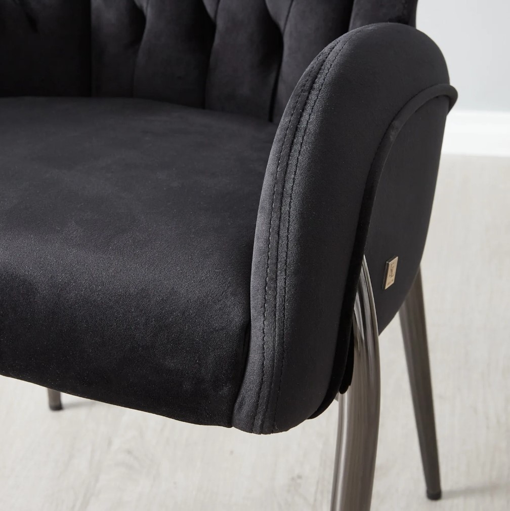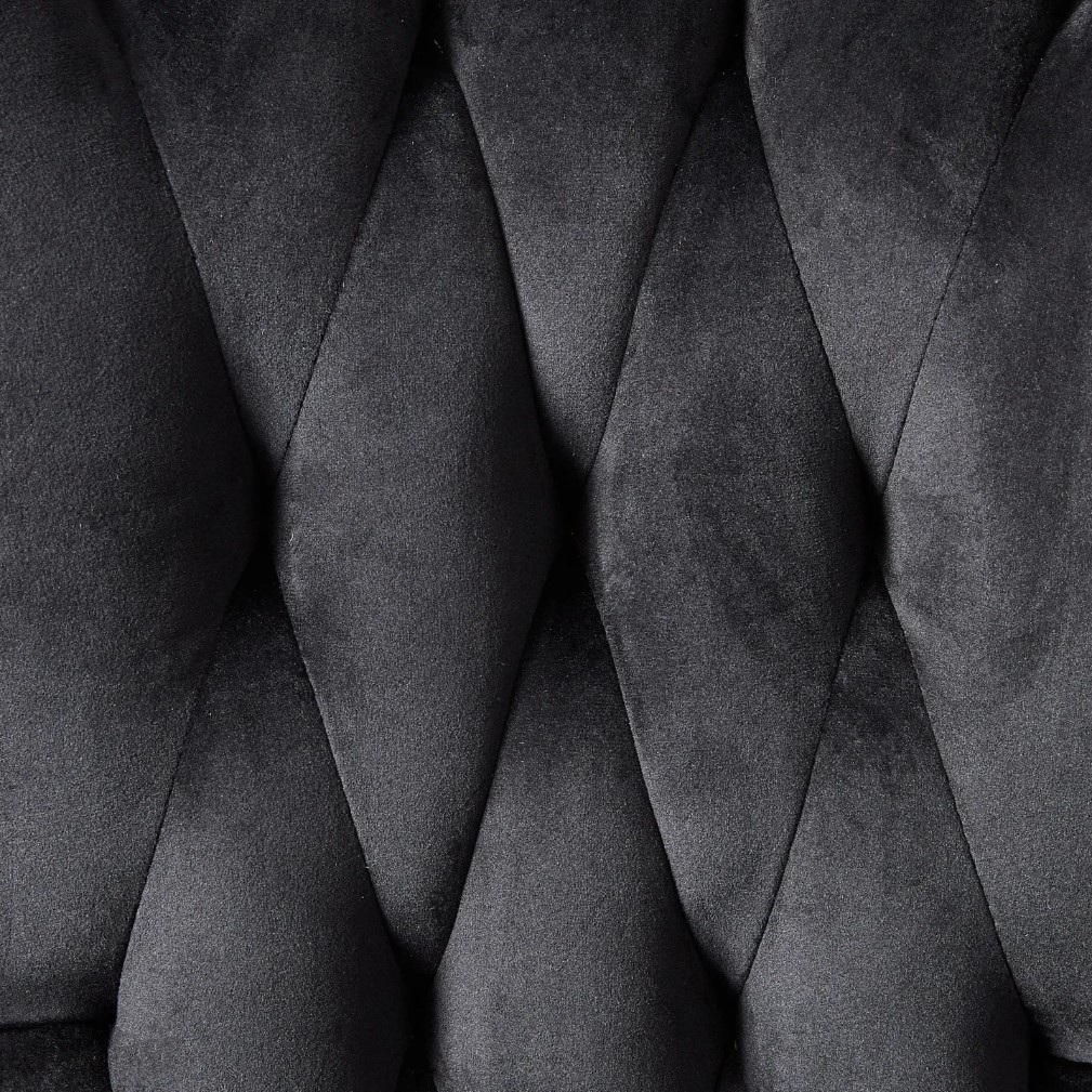 The chair's angled armrest design further adds to its visual appeal. Crafted with the utmost precision, the Henry Chair is upholstered in premium quality velvet fabric that exudes luxury and refinement. The sleek black-coloured velvet not only lends an air of sophistication but also offers an irresistibly soft texture, adding to the overall lounging experience. The meticulous diamond tufting on the chair's backrest elevates its aesthetic, creating a plush and cushioned look that exudes opulence. Supporting the piece is a collection of stainless steel legs that come in matching black nickel colours.
