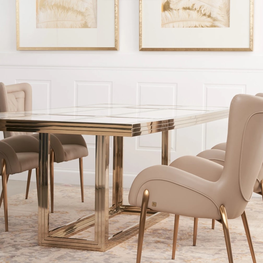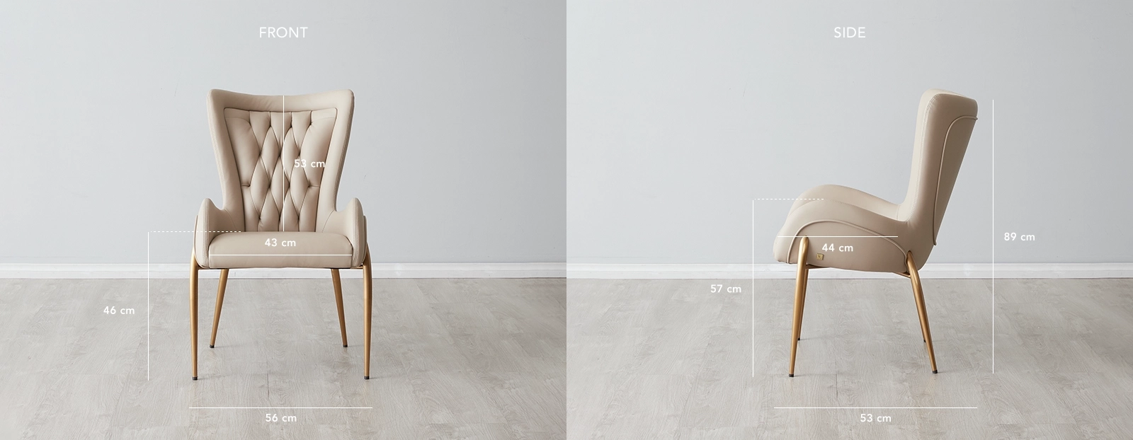 The chair's angled armrest design further adds to its visual appeal. Crafted with the utmost precision, the Henry Chair is upholstered in premium quality vegan leather that exudes luxury and refinement. The Sand-coloured Leather not only lends an air of sophistication but also offers an irresistibly soft texture, adding to the overall lounging experience. The meticulous diamond tufting on the chair's backrest elevates its aesthetic, creating a plush and cushioned look that exudes opulence. Supporting the piece is a collection of stainless steel legs that come in matching brushed gold colours.