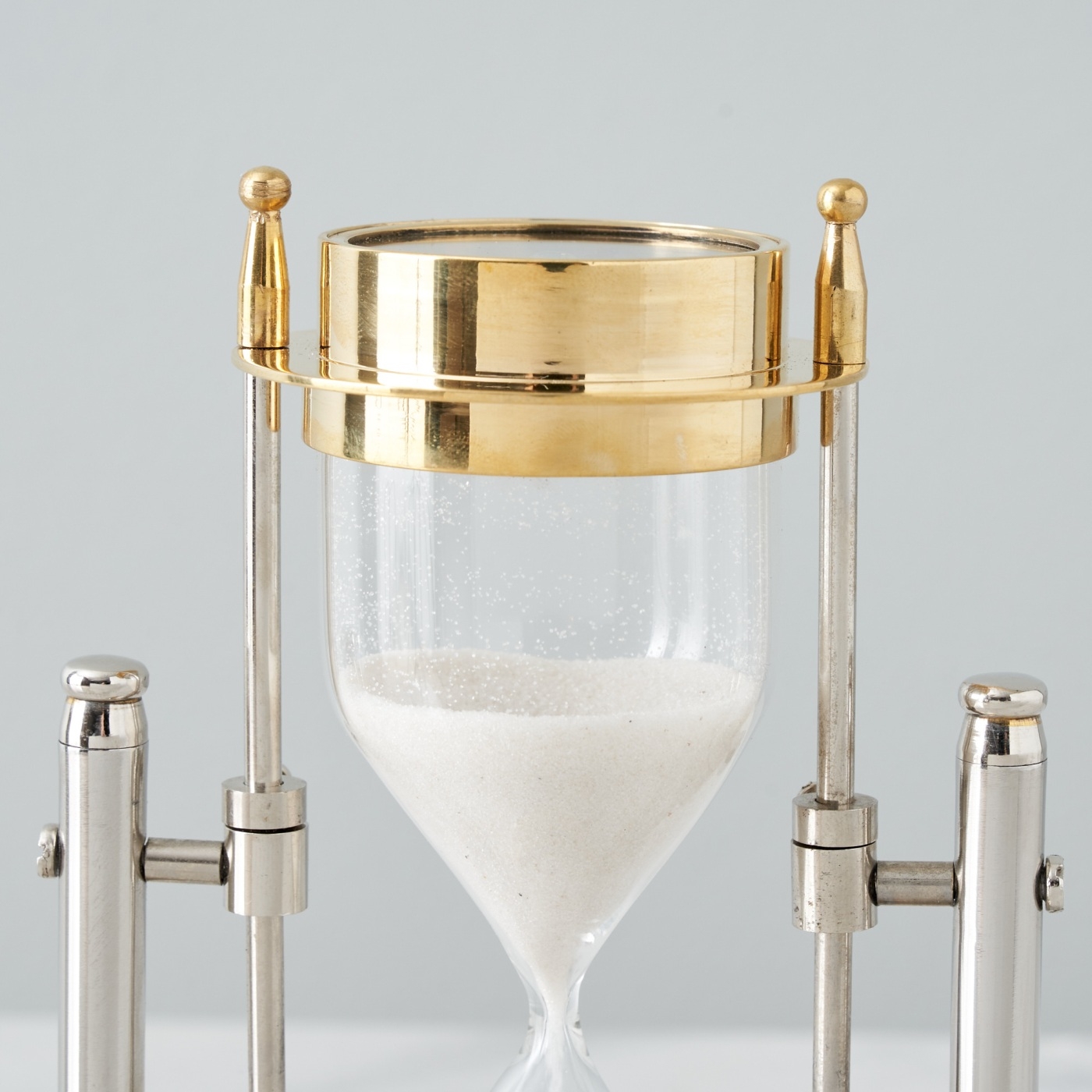 We've designed an hourglass-shaped replica that is meant for decorative purposes only and does not accurately measure the passage of an hour. This elegant piece shines with a brass and nickel finish that will add a luxurious glow to your space.