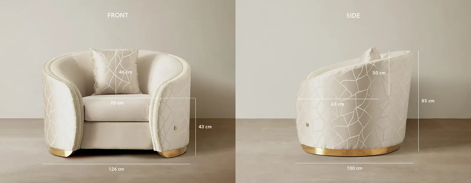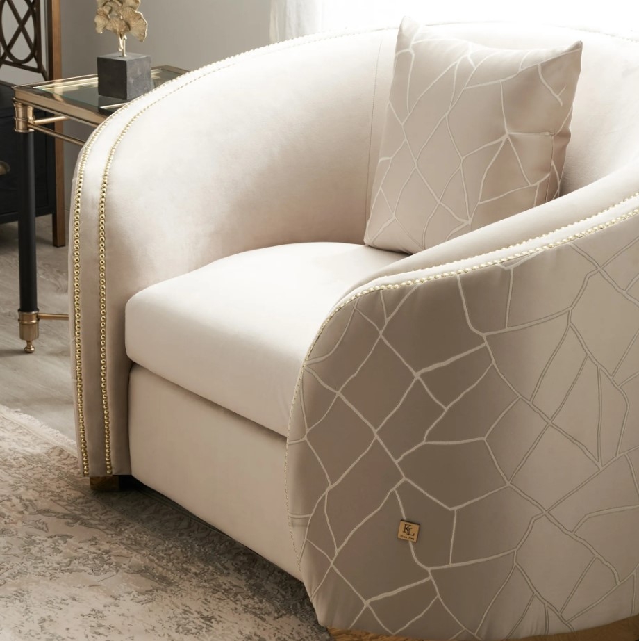 The Hyacinth Chair features a stylishly curved frame inspired by classic designs, offering a chic and modern look. Upholstered in luxurious light cream velvet, it exudes a soft glow and cozy aesthetic.