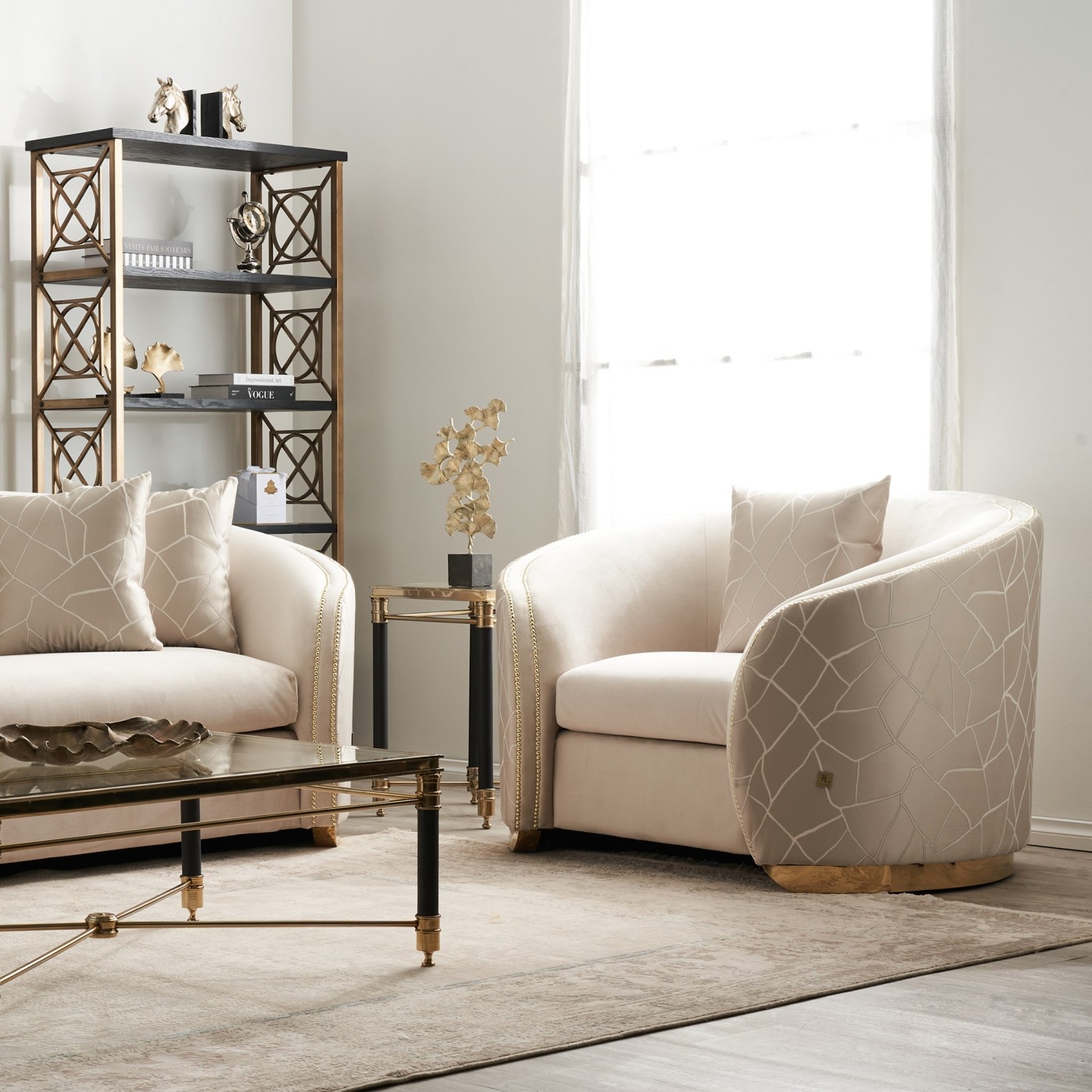 The Hyacinth Cream Velvet Chair features a luxurious design with golden bead detailing along its outline, a shell-like pattern on the back, and a gold-colored steel frame for elegant support.
