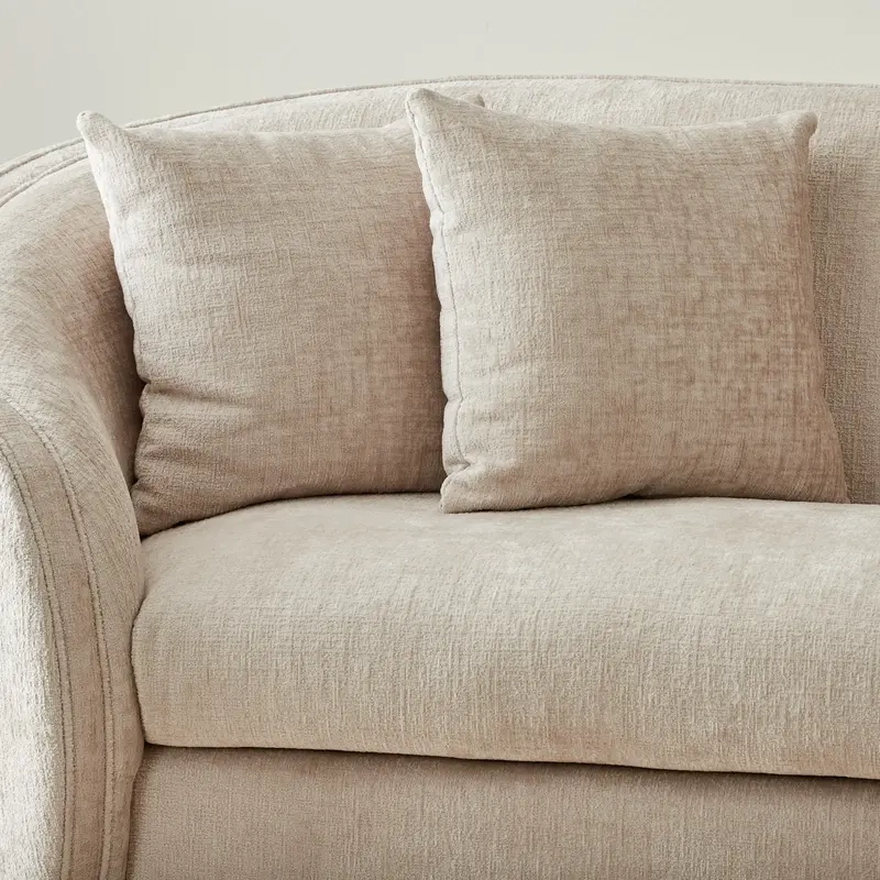 The Hyacinth Sofa offers a curved, modern design with soft chenille fabric for comfort. Its seamless silhouette provides generous seating space for three.