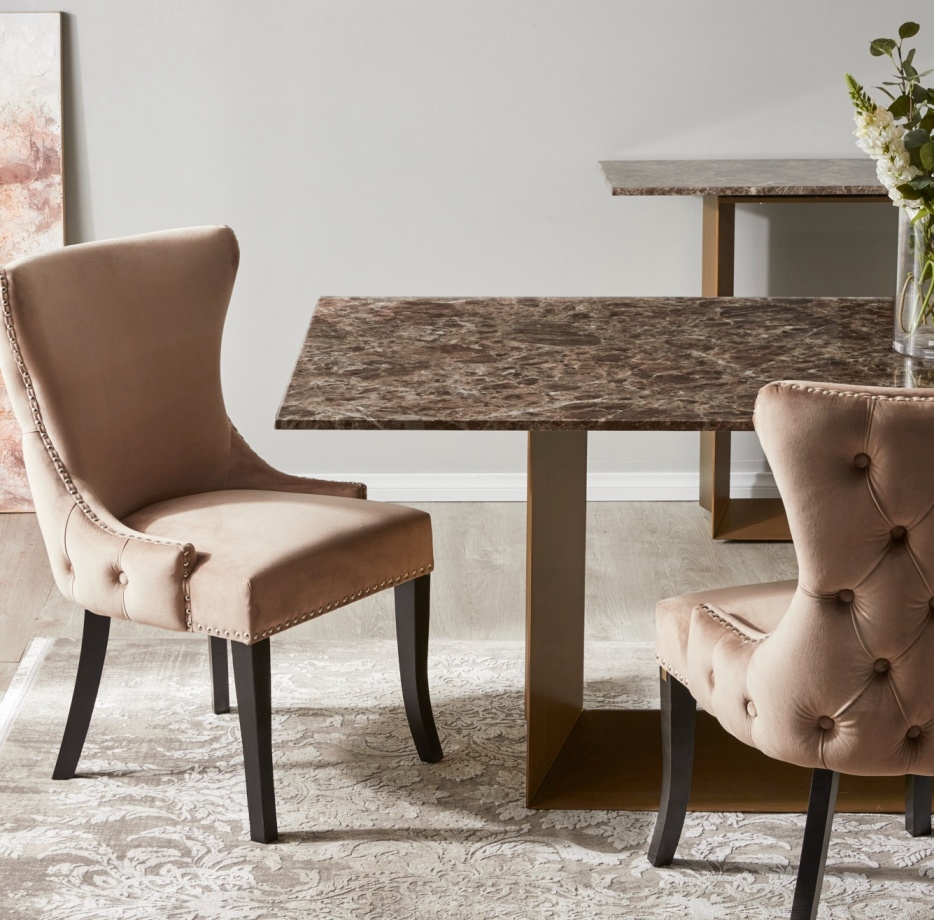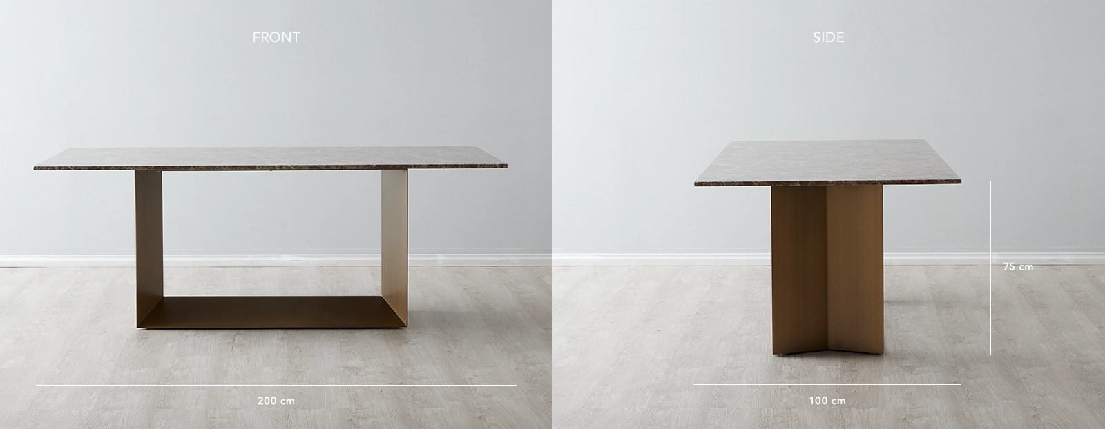 A brushed bronze frame provides both stability and generous legroom, ensuring a comfortable dining experience. Perfect for entertaining, this table comfortably seats up to eight guests and pairs beautifully with our range of dining chairs.