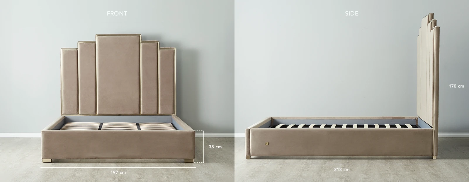 The bed's exterior is upholstered with top-of-the-line Beige velvet fabric for a luxurious look and sumptuous feel. Resourcefully designed sprung slats are also present to provide flexibility and reduce wear and tear on your mattress. The Jacques Bed will provide you with lasting comfort and timeless beauty for years to come. This gorgeous piece is best paired with a glass side table and an exquisite mirror.