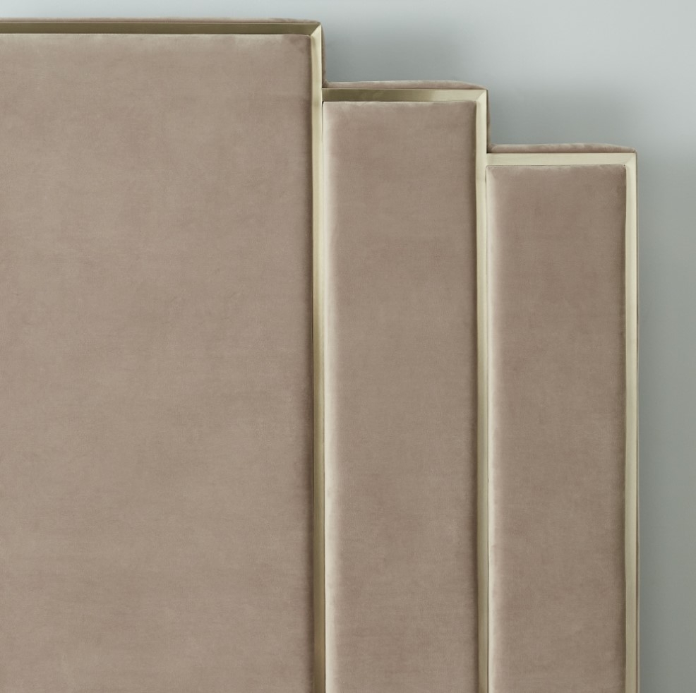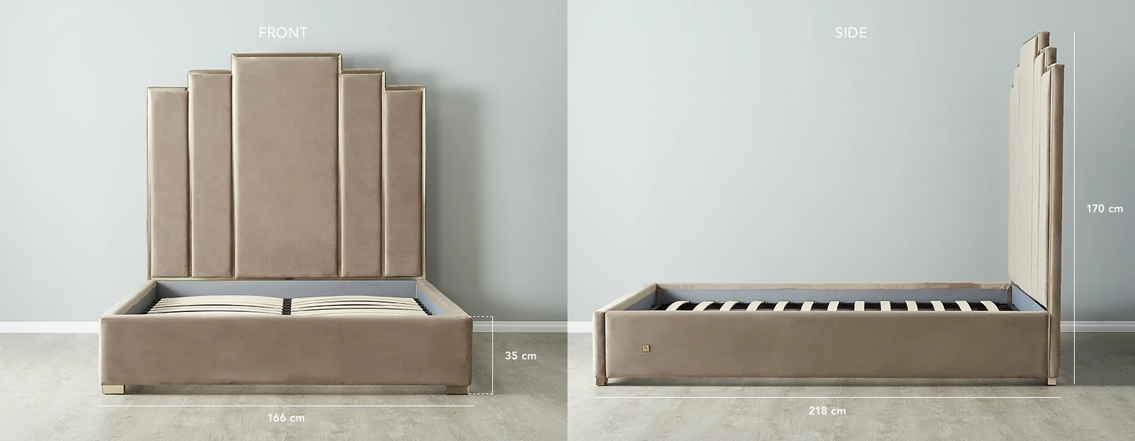 The bed's exterior is upholstered with top-of-the-line Beige velvet fabric for a luxurious look and sumptuous feel. Resourcefully designed sprung slats are also present to provide flexibility and reduce wear and tear on your mattress. The Jacques Bed will provide you with lasting comfort and timeless beauty for years to come. This gorgeous piece is best paired with a glass side table and an exquisite mirror.