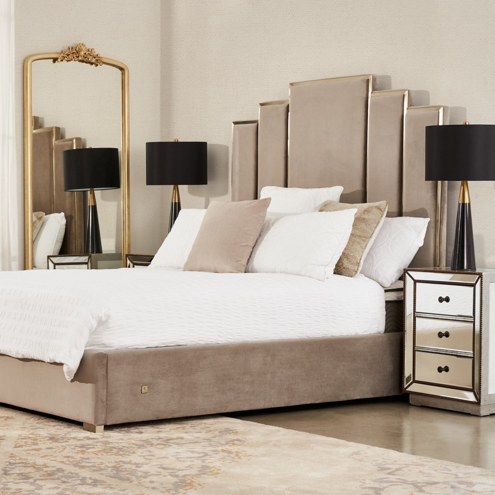 Give your bedroom a luxurious makeover with the Jacques Beige Velvet Queen Bed. This majestic piece is made from high-quality materials and features a stunning art-deco-inspired design. Rest and recharge in comfortable bliss along its comfortable borders. A cascading horizontal panel sectioned into five parts makes the headboard resemble a throne for a Queen or King.