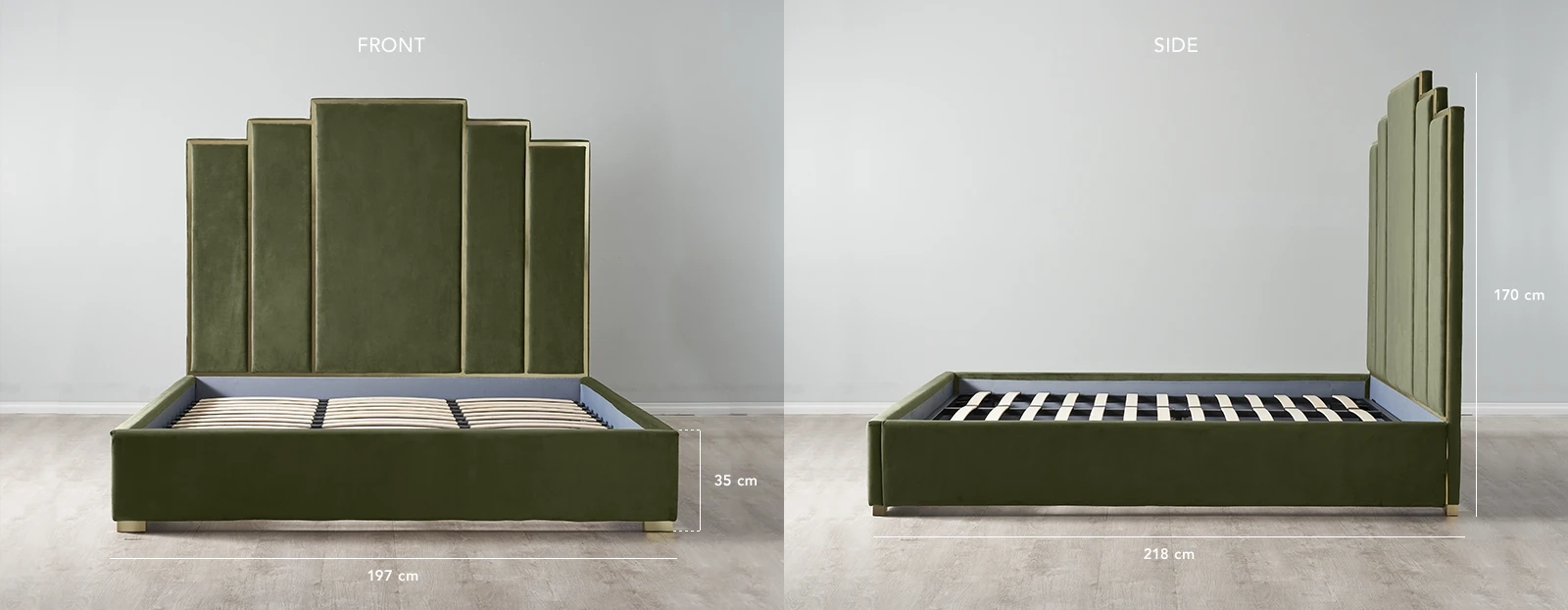 The bed's exterior is upholstered with top-of-the-line Olive Green velvet fabric for a luxurious look and sumptuous feel. Resourcefully designed sprung slats are also present to provide flexibility and reduce wear and tear on your mattress. The Jacques Bed will provide you with lasting comfort and timeless beauty for years to come. This gorgeous piece is best paired with a glass side table and an exquisite mirror.