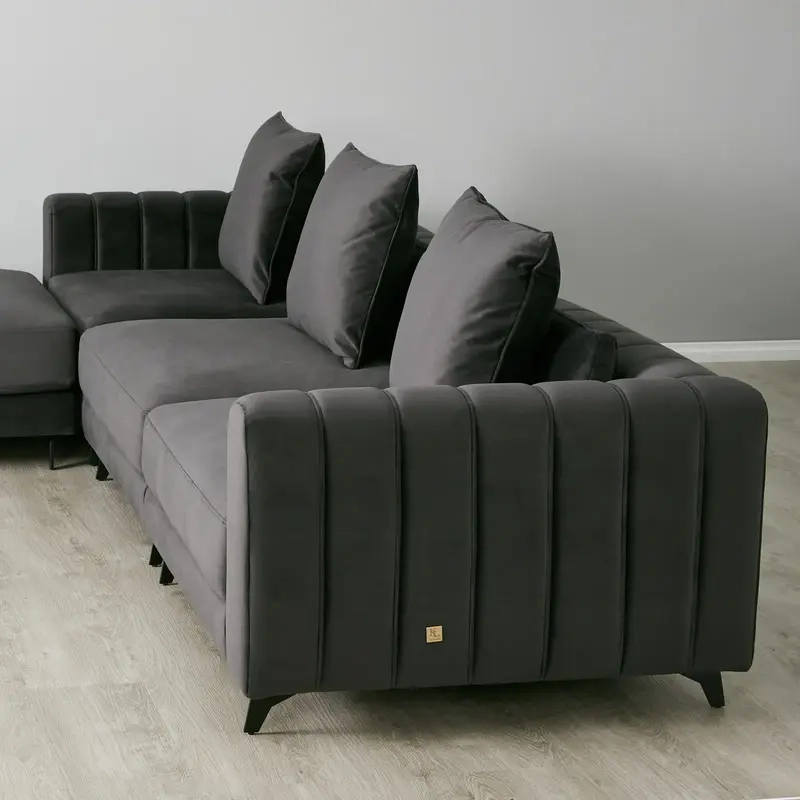 With a tuxedo-inspired silhouette, the Jordan Corner Sofa is upholstered in luxurious charcoal velvet, adding a rich, textured look to your space. The corner configuration provides ample seating, combining elegance with practicality.