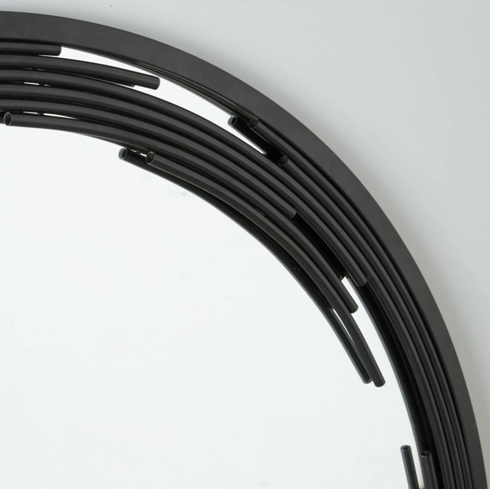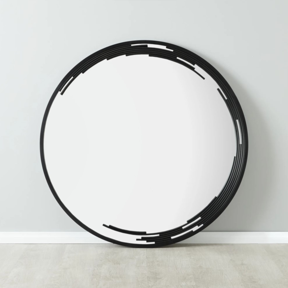 The Jubilee Mirror is a captivating fusion of art deco inspiration and contemporary design. This black circular masterpiece is framed by multiple uniquely fragmented frames, each segment casting a dance of angles and edges that makes the mirror not just a functional piece but a conversational art statement.