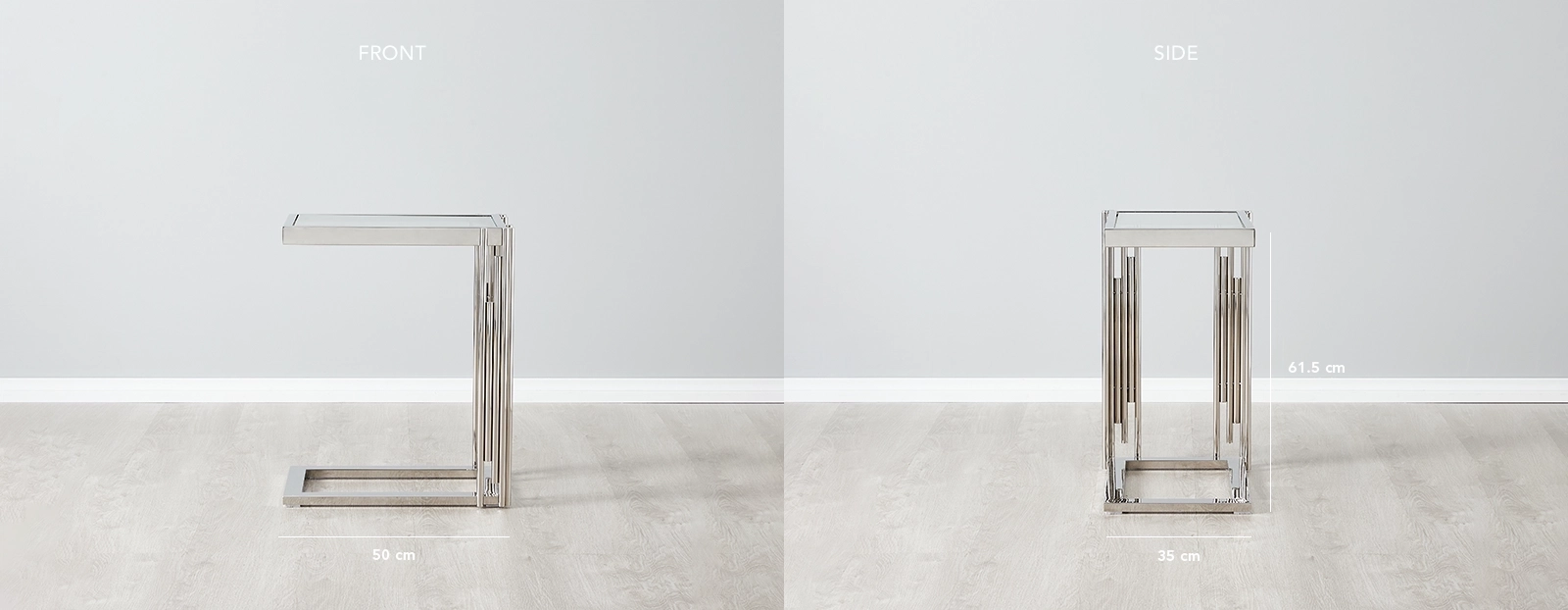 The Jules Polished Silver Stainless Steel Side Table combines a functional design with art-deco inspiration, featuring a unique frame of stainless-steel tubes. Its sleek structure makes it an ideal sofa sliding table for convenient lounging.