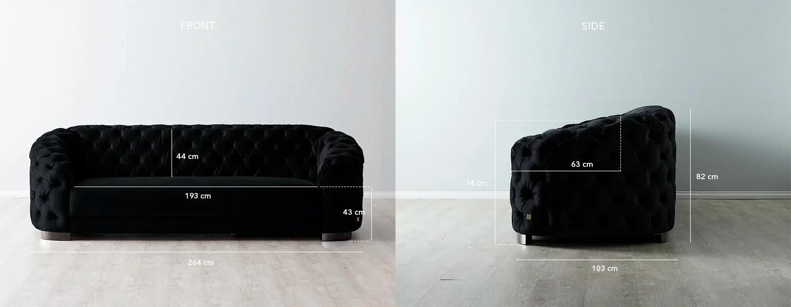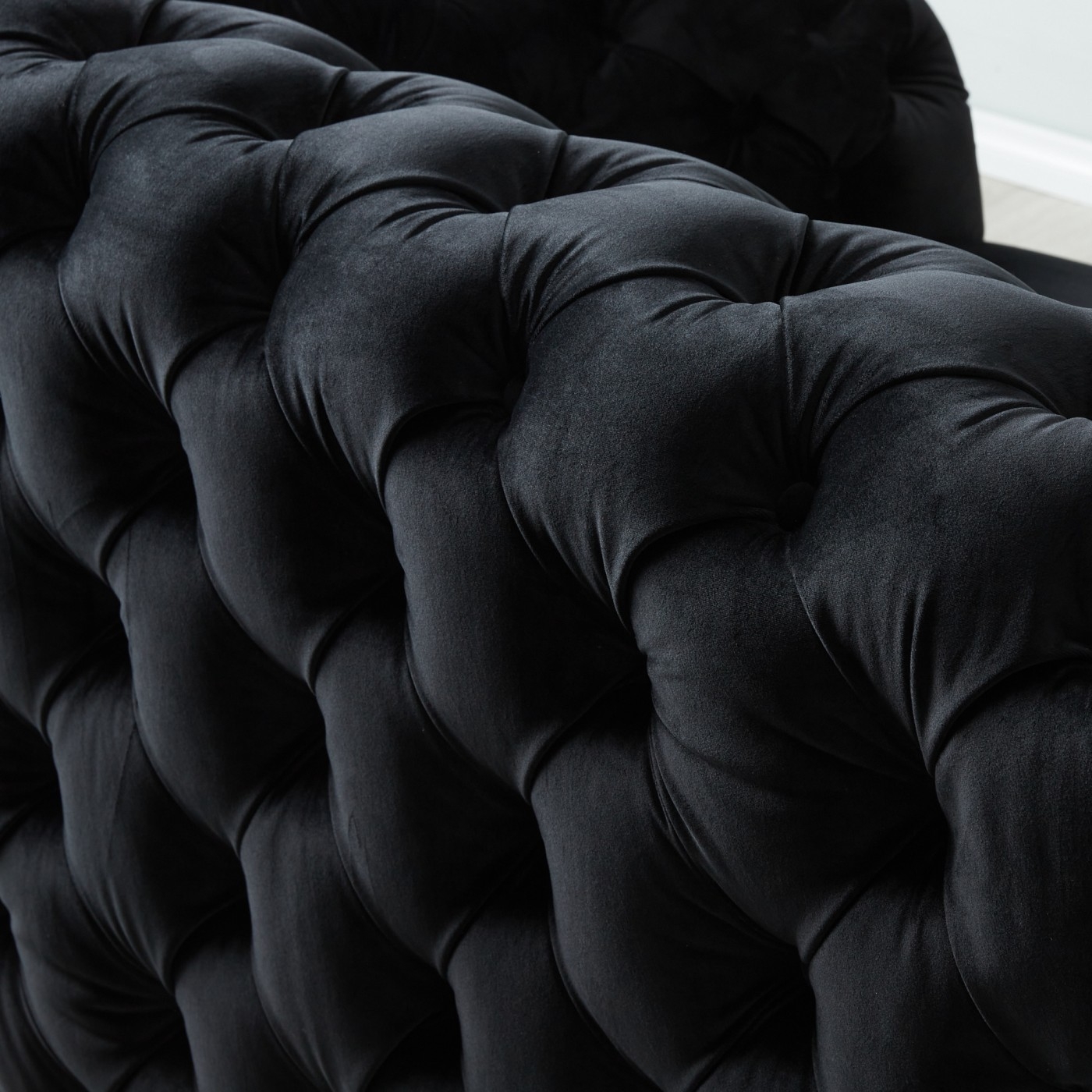 The Kelly Black Velvet 3-Seater Sofa offers an Art Deco twist on the classic Chesterfield design. It highlights its elegance with its tufted sections, draped in velvet fabric in a sleek Black coloured shade.