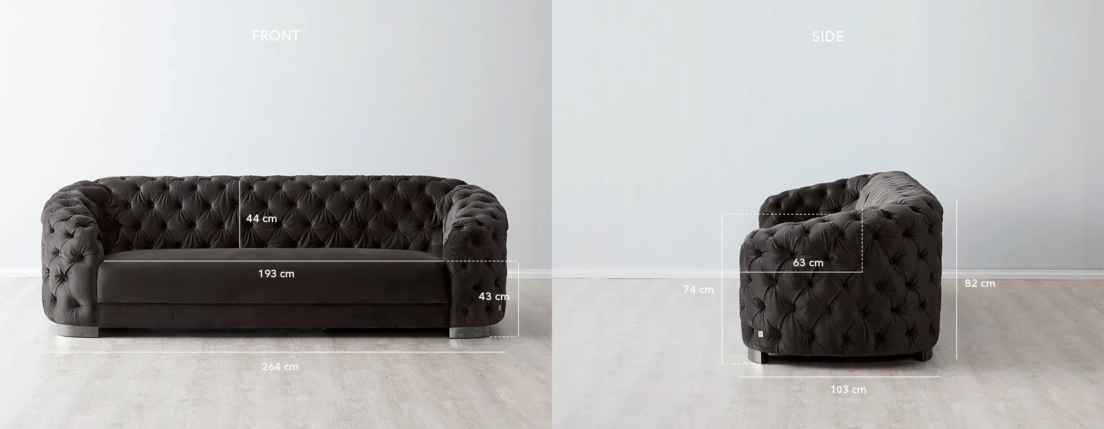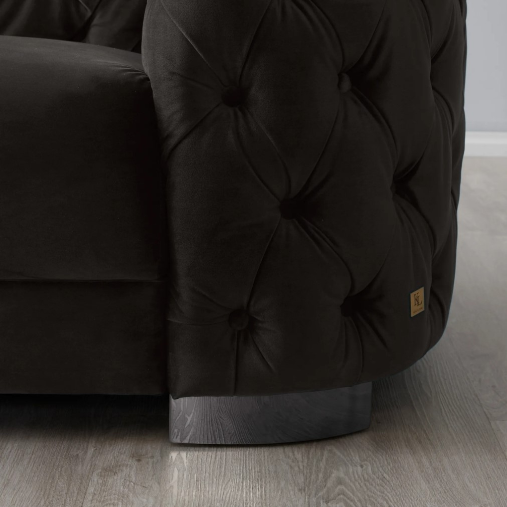 The Kelly Charcoal Velvet 3-Seater Sofa offers an Art Deco twist on the classic Chesterfield design. It highlights its elegance with its tufted sections, draped in velvet fabric in a luxe Charcoal shade.