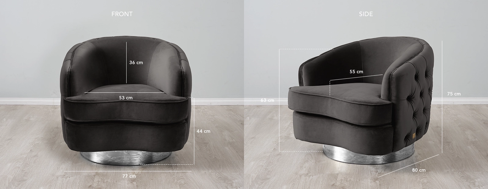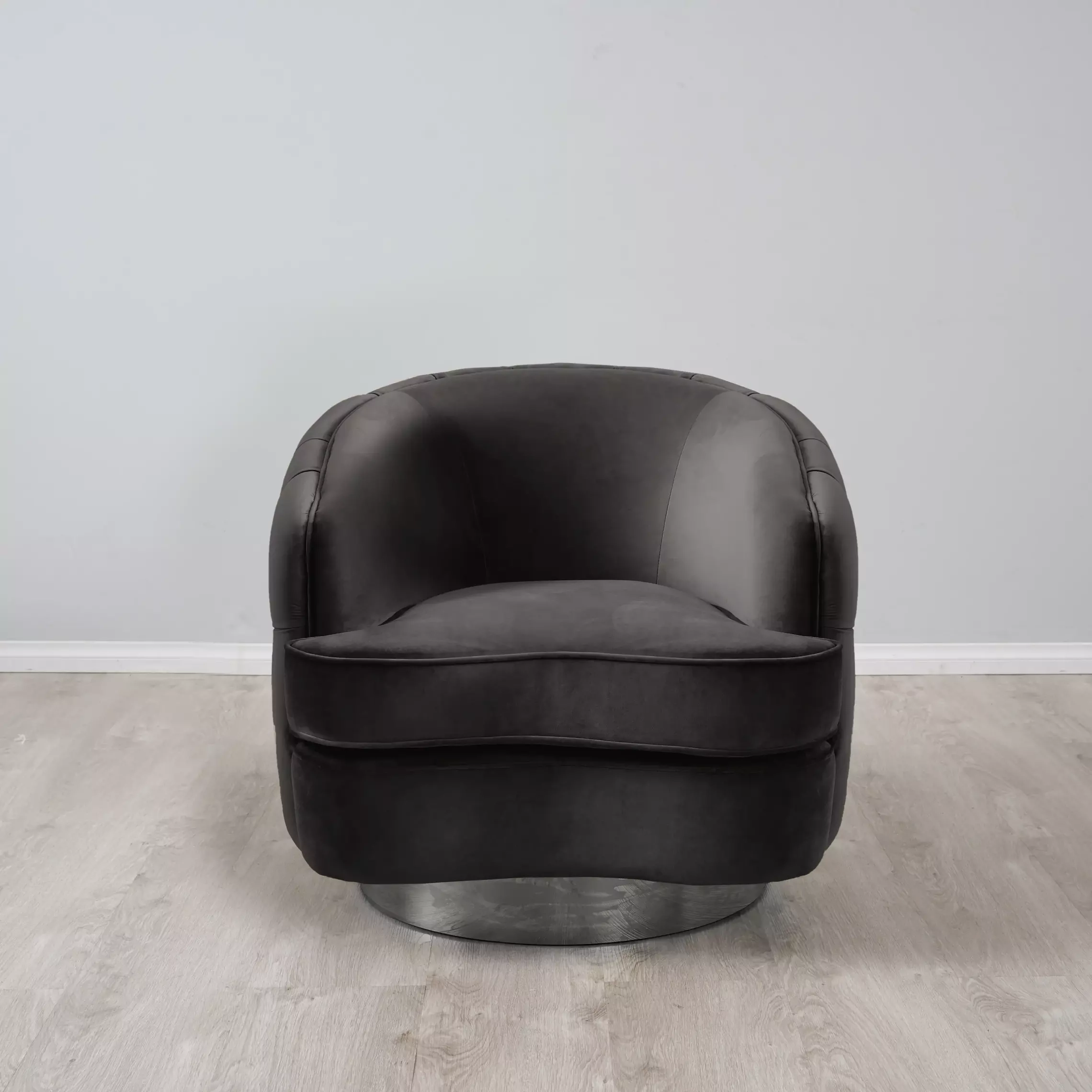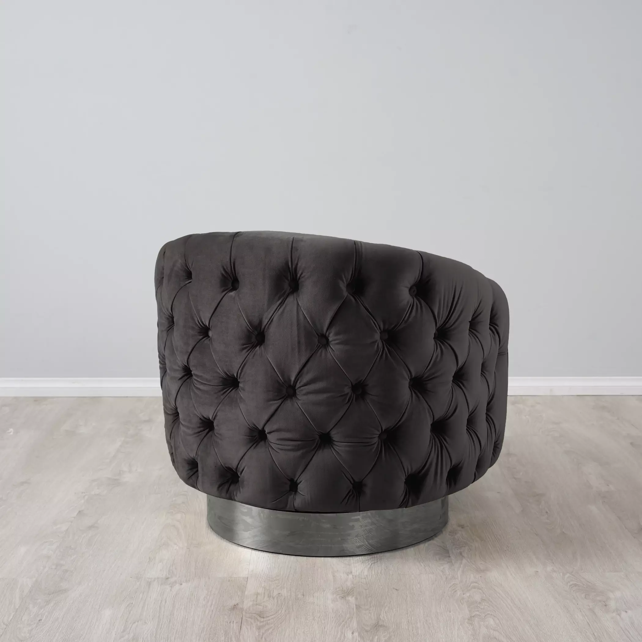 The Kelly Swivel Chair blends Art Deco style with comfort, featuring charcoal velvet upholstery on a meticulously crafted wooden frame. Its hand-done button tufting enhances the plush, luxurious appearance.